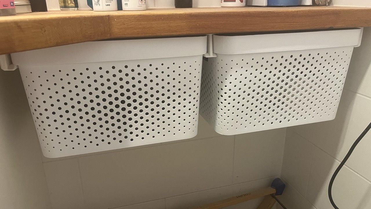 Bộ ray gắn dưới bàn cho hộp/thùng CURVER INFINITY 11L & 17L (không nắp): ray trái, phải và ray giữa. Có bản LONGSIDE/NO LONGSIDE, thêm SIDEMOUNT để bắt trực tiếp lên vách; remix từ IKEA Trofast.