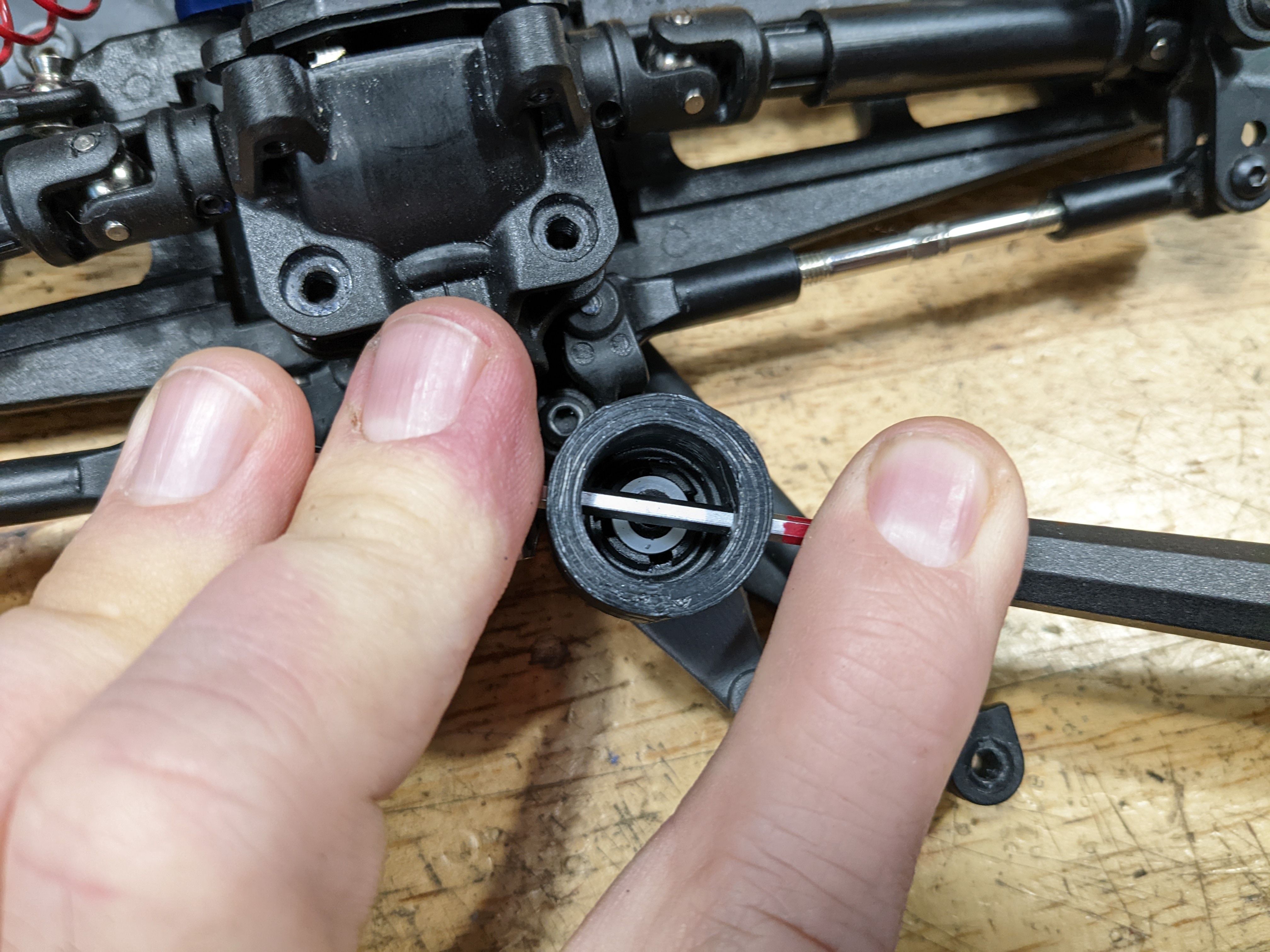 RTV Steering Arm Install Tool - steering arm có lò xo rất cứng cho chức năng servo-saver nên gắn lại khá khó. Vòng (ring) trên đầu lò xo đặt vào đáy của tool, rồi dùng tua vít, lục giác (allen wrench), v.v. xuyên qua lỗ phía trên làm tay cầm. Dùng tool để nén lò xo và thả washer màu trắng vào. Có tool rồi mà vẫn mệt!