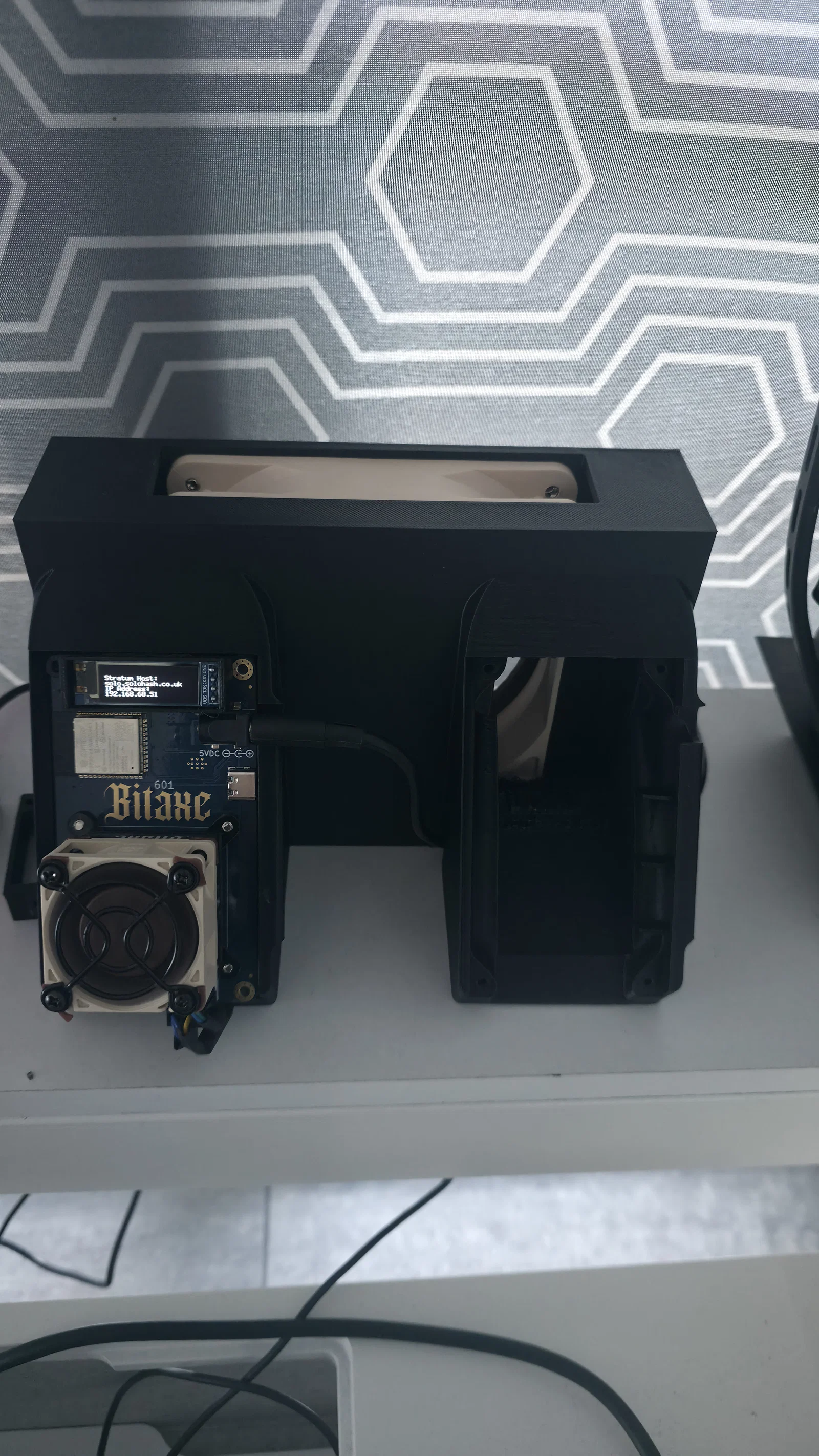 Đúng như tên gọi, đây là mẫu cho 2 bộ Bitaxe (hiện tại là Gamma 601). Enclosure dùng quạt 120mm thổi gió, ép luồng khí đi xuống và thoát ra ở phần đáy của Bitaxe.