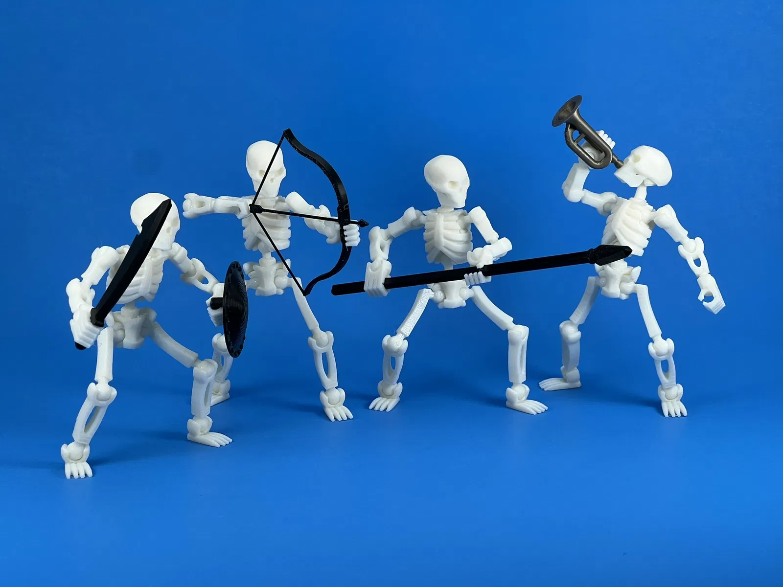 NYEH HEH HEHH! Tạo đội quân skeleton khớp linh hoạt, kèm bộ vũ khí đầy đủ: kiếm, khiên, giáo, trumpet và cung (kéo/thả). File có 3MF gộp, không cần supports, cao hơn 10cm ở 100% scale.