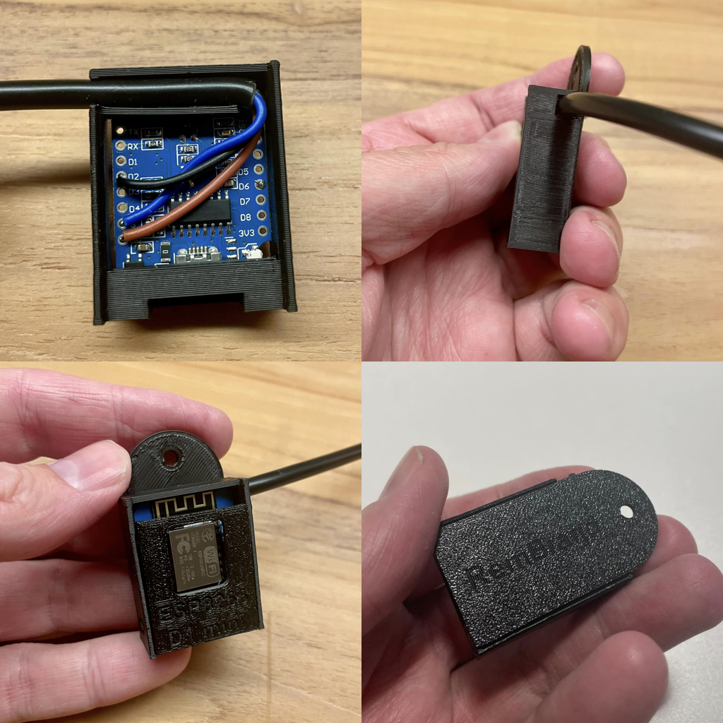 Thiết kế này nhắm tới WeMos D1 mini không gắn headers, nơi cảm biến được hàn trực tiếp lên bo (xem hình). Dù mình đang dùng cho cảm biến tiệm cận, nó cũng nên chạy ngon với các cảm biến khác có đường kính dây tương tự—đúng rồi, mình đang nhìn bạn đó DS18B20!
