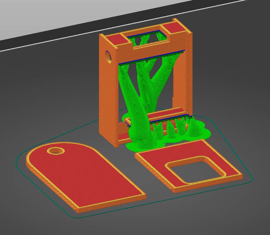 Chữ trên cả nắp và tấm back-plate nên đặt úp xuống mặt (PEI) plate của bạn, và nó cho biết mặt nào hướng ra ngoài. Phần thân vỏ chính mình in theo phương thẳng đứng, với mặt lớn nhất quay xuống dưới. Lý do là để các rãnh (slits) mà nắp bấm vào được cứng hơn. Xem hình thứ ba để thấy ví dụ.
