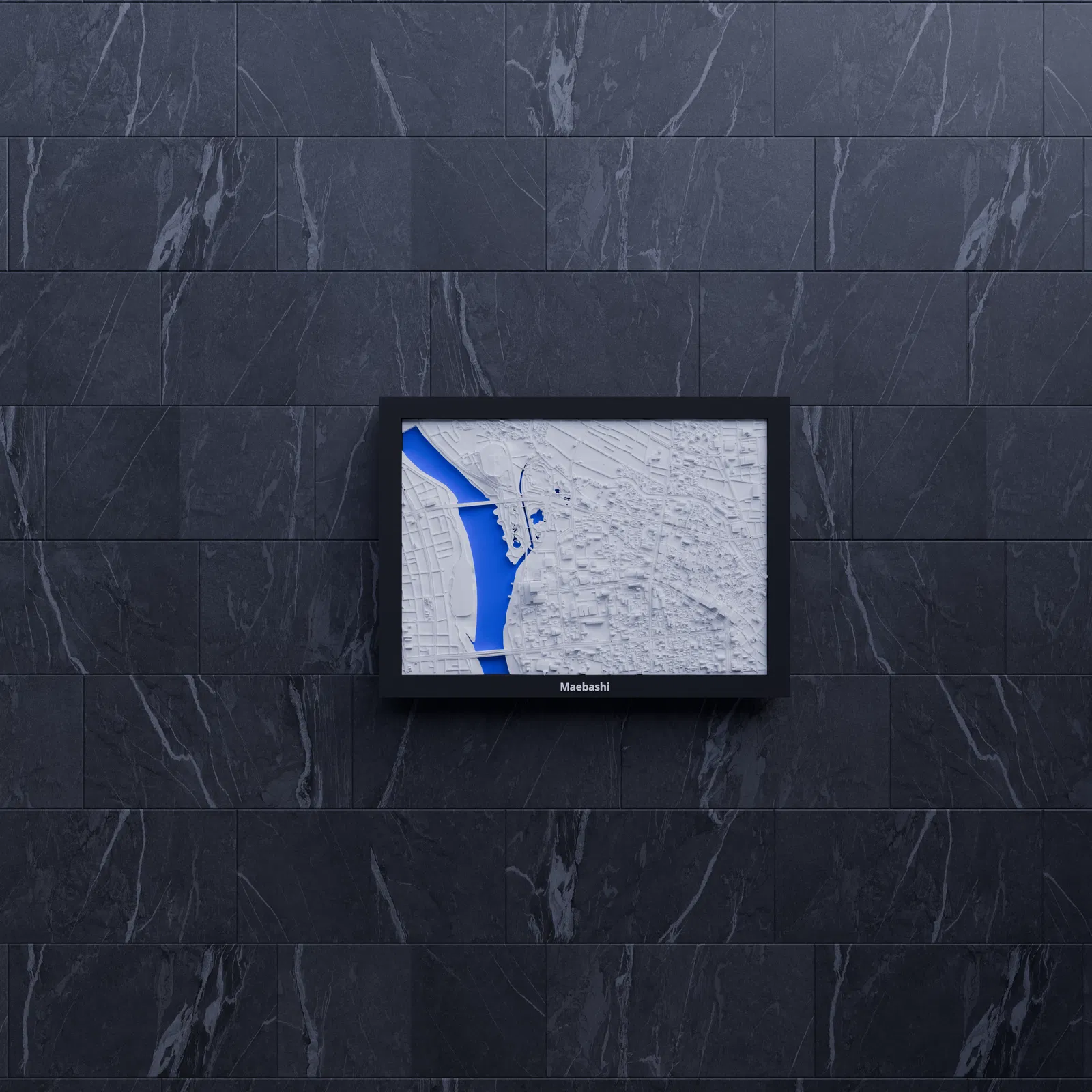 Mô hình địa hình thu nhỏ in 3D của Maebashi (Nhật Bản), dựng từ dữ liệu địa lý quanh tọa độ 36.393, 139.063. Thu nhỏ từ 2.049×1.429 km xuống 170.5×119.5 mm, tỷ lệ ~12014:1, kèm nhiều frame có lỗ treo.