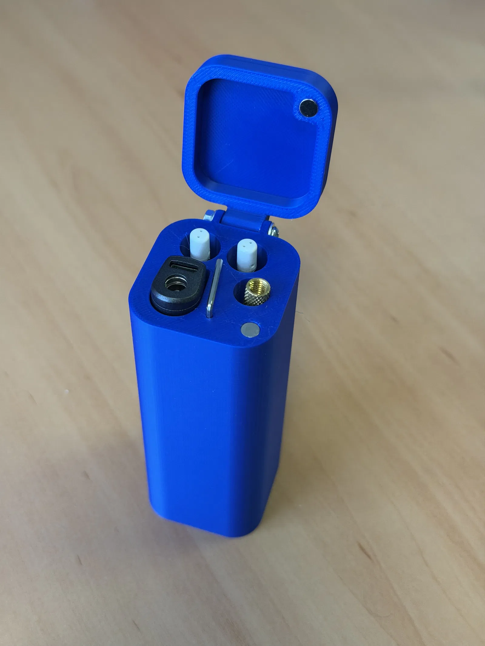 Mình rất thích thiết kế của model của Miidazz, nhưng lại thấy thiếu chỗ để cất các heat set insert adapters và cây hex key. Mình đã thiết kế lại mẫu này từ đầu, nhưng ý tưởng tổng thể vẫn dựa trên model gốc. Ngoài việc thêm không gian chứa đồ, mình còn đổi phần bản lề để bắt vít bằng một bộ M3x20 kèm hai cái washer và một cái nut. Hai hốc gắn nam châm sẽ vừa loại magnet 5x3 và nên cho độ ép chặt (press fit) khá ổn.