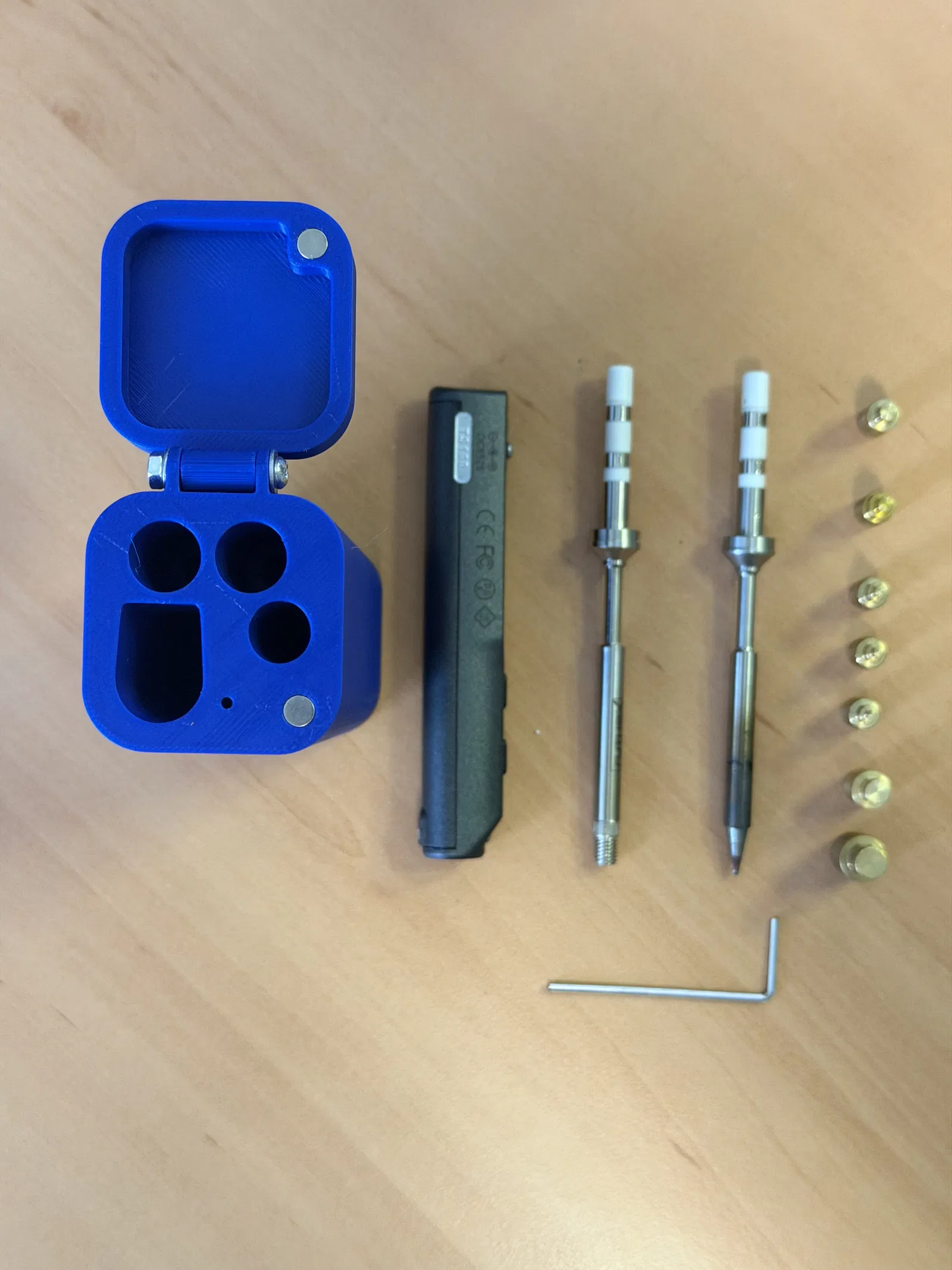 Hộp đựng cho TS-100 kèm chỗ để 2 tip, heat set insert adapters và hex key. Thiết kế lại từ đầu dựa trên ý tưởng model gốc, bản lề dùng M3x20 + 2 washer + nut, hốc nam châm cho magnet 5x3 press fit.