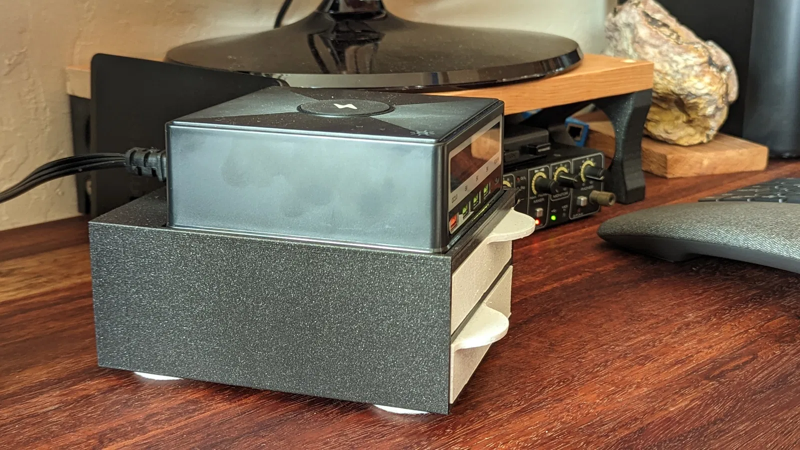 Mình in tủ bằng PLA màu galaxy black và marble grey để hợp tông màu với charger. Mình dùng nozzle 0.6mm, rất đáng khuyến nghị. Nó giảm thời gian in xuống còn khoảng 60% so với nozzle 0.4mm tiêu chuẩn, mà nhìn vẫn đẹp y như vậy. Cuối cùng, mình dán thêm miếng felt pad có keo sẵn ở đáy tủ.