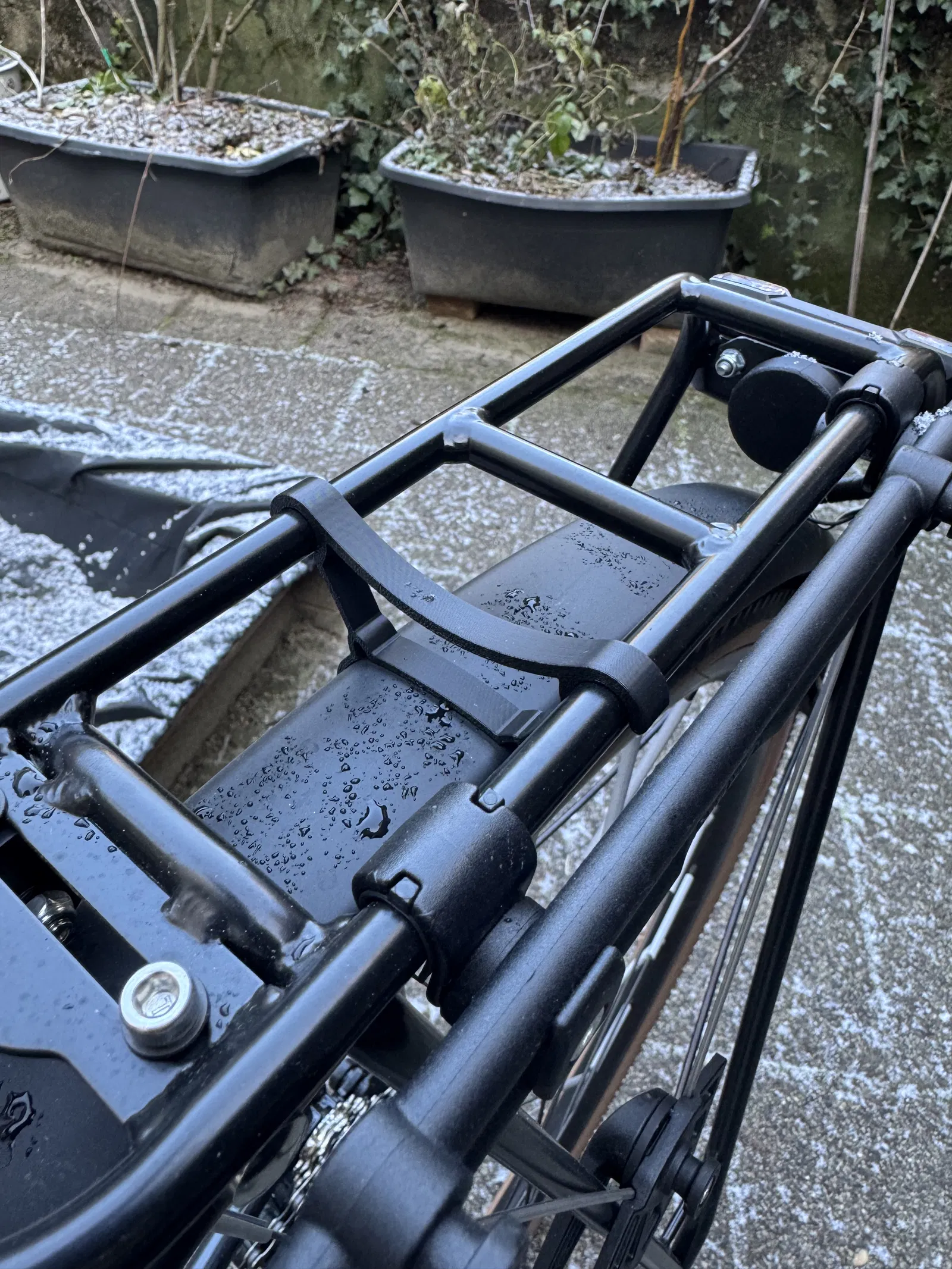 Mình tạo món này để giải quyết tình trạng chắn bùn sau bị xệ dần theo thời gian, làm tăng lực kéo lên dây cáp đèn sau tích hợp. Trường hợp của mình, phần bị xệ cuối cùng khiến dây bị tuột khỏi đèn sau. Cái kẹp này tạo thêm một điểm đỡ chắc chắn giữa baga (rack) và phần splash guard để mọi thứ luôn thẳng hàng.