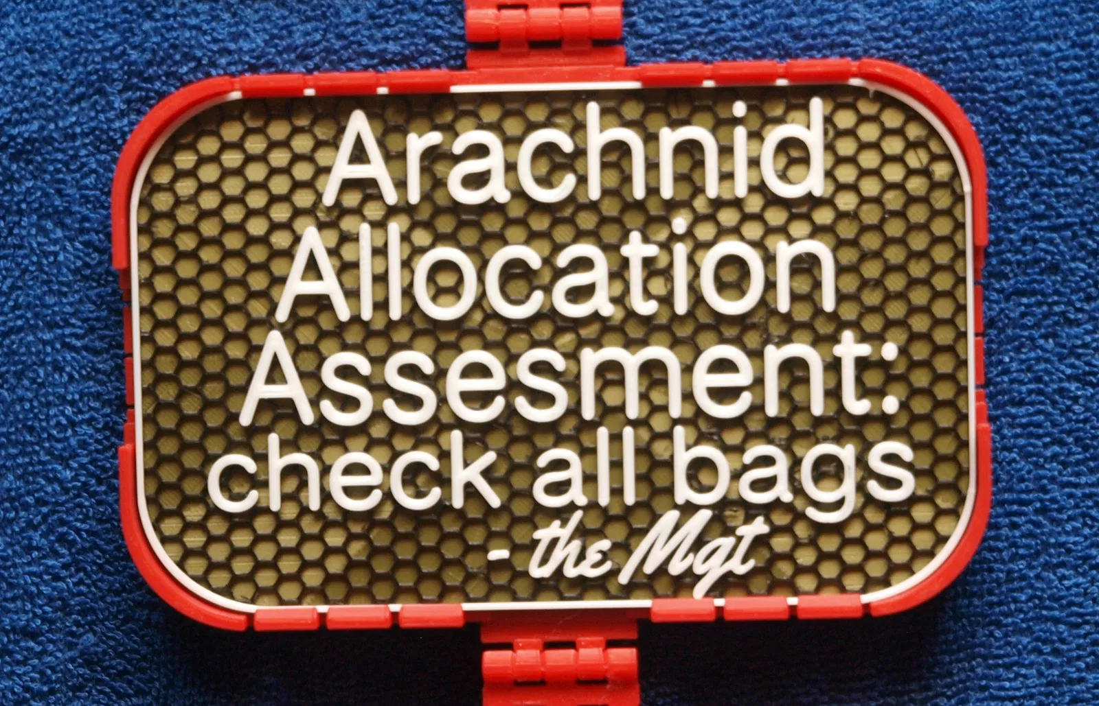 Bảng 3D print 100x160mm “Mgt Sign: Arachnid Allocation Assesment”. Có file Mesh và Solid; khuyến nghị đổi màu (color switch) trên 1mm như gcode kèm theo. Có thể trưng trong Shadowbox Frame.