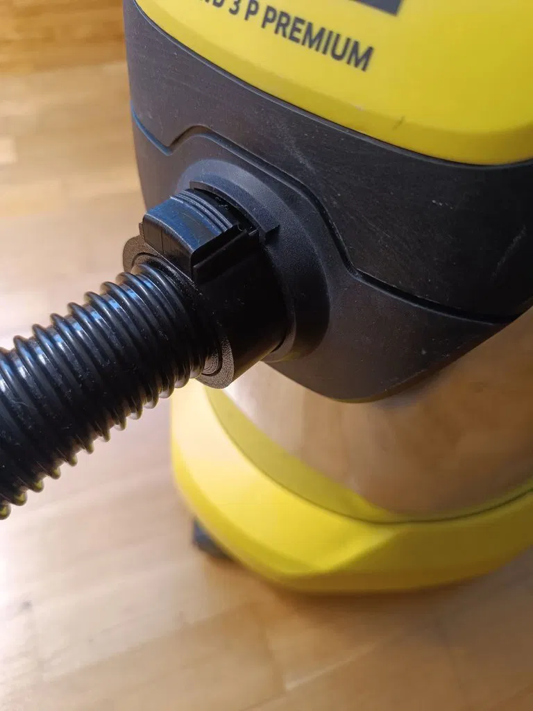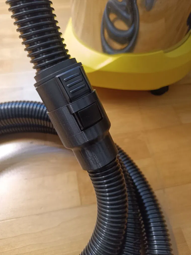 Đây là một adapter nối dài ống hút bụi in 3D chắc chắn, thiết kế riêng cho Karcher WD3, WD4 và các dòng máy hút bụi ướt/khô tương thích. Mẫu này mô phỏng hệ quick-connect zin, nhưng nâng cấp điểm quan trọng: khớp xoay swivel quay tự do ở cả hai đầu để ngăn ống bị gập/kẹt khi sử dụng.