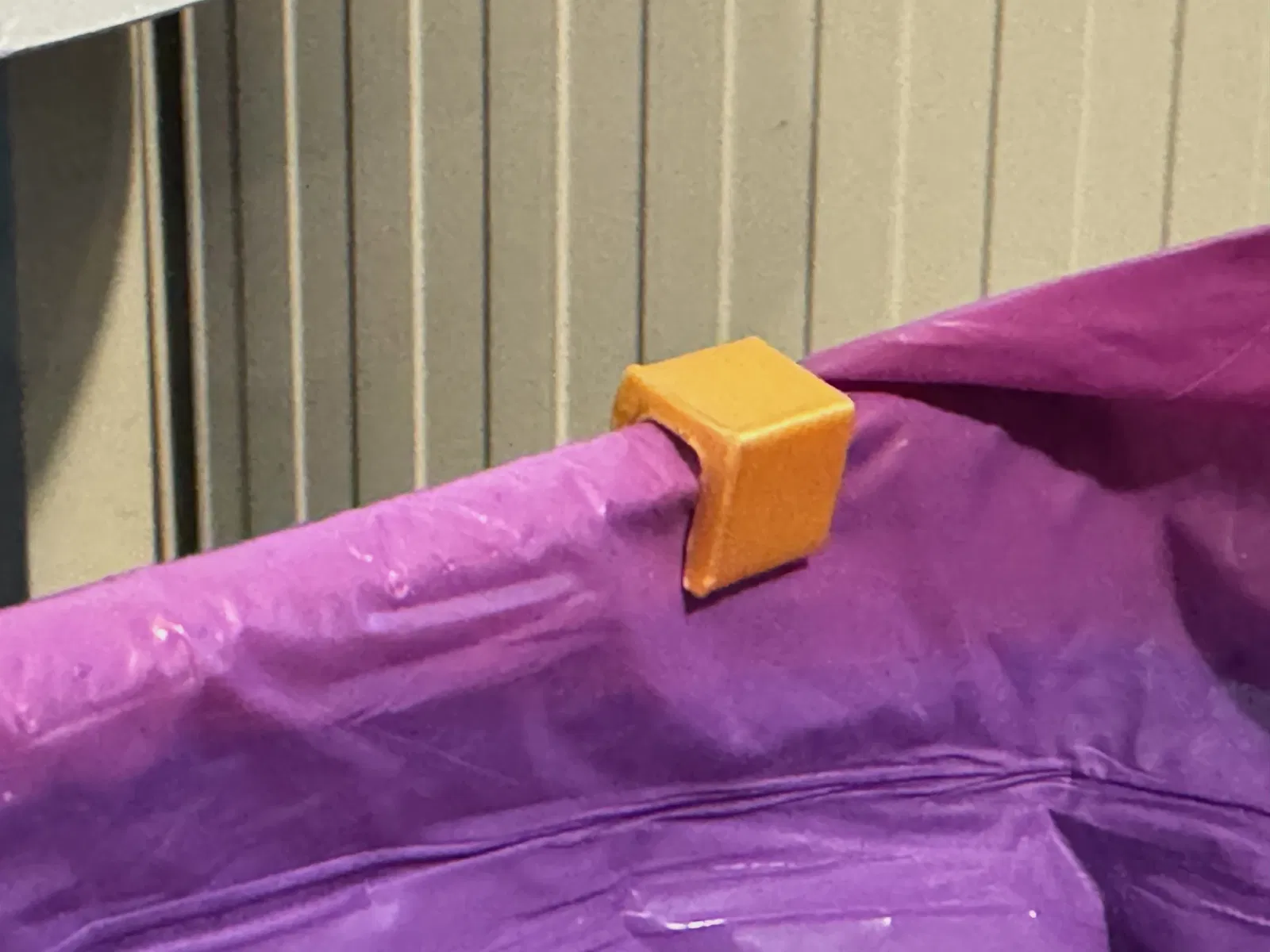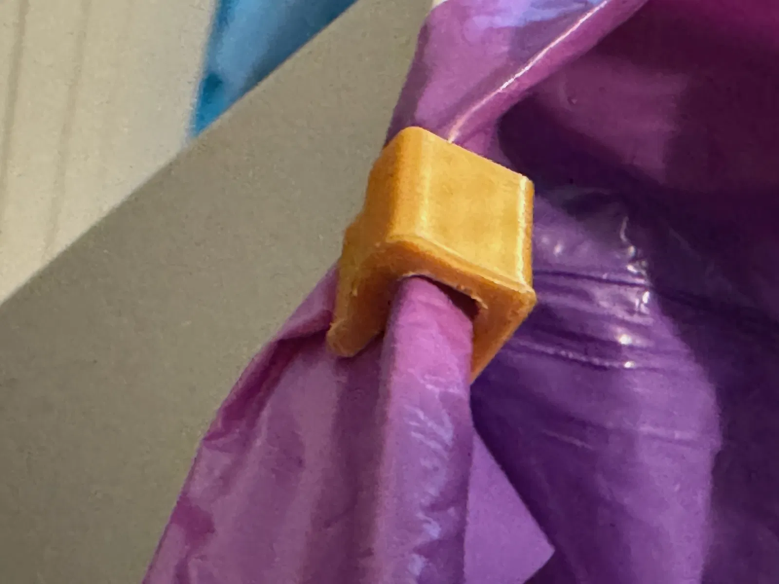 Kẹp mini giúp cố định túi rác ở mặt sau thùng rác Ikea GÅRDSBUTIK. In bằng PLA với nozzle 0.4 mm và layer 0.2 mm, rồi gắn vào phía sau gờ với mặt thẳng của kẹp hướng ra trước.