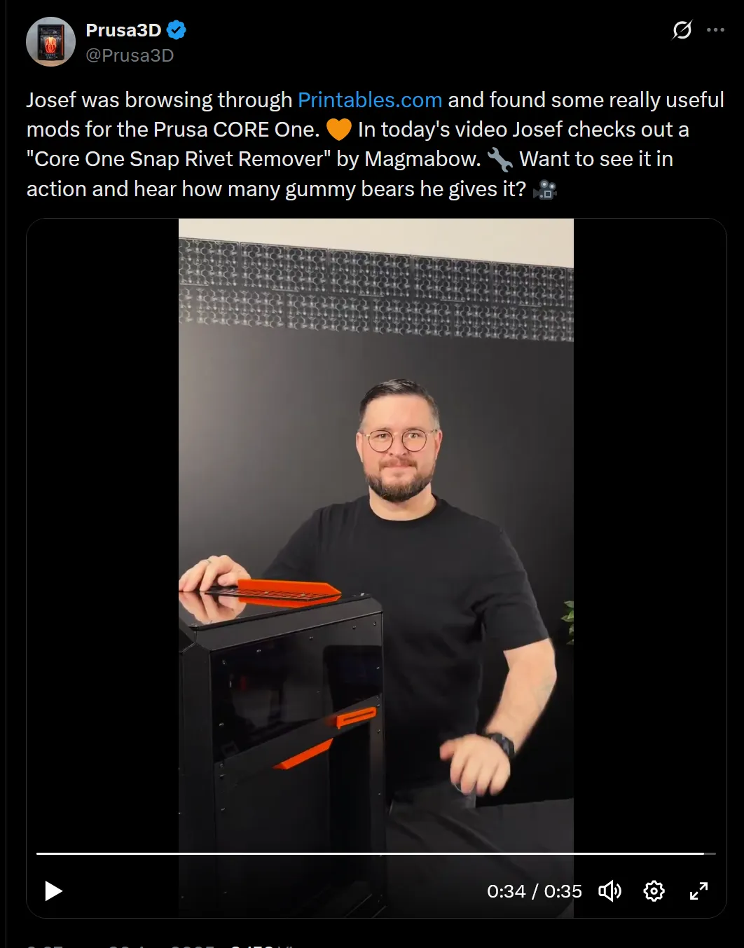 Dụng cụ tháo snap rivet cho Core One. Có thể pause giữa chừng khi in để đổi màu và nhét 2 nam châm 4×2mm vào tay cầm. Nam châm là tuỳ chọn; in bình thường vẫn dùng được. Khuyến nghị PETG/ABS.