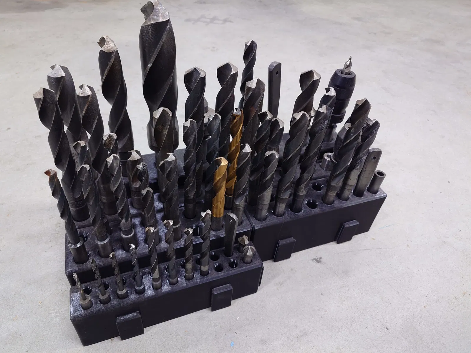 Bộ khay mũi khoan Morse taper dạng mô-đun từ MT1 đến MT4, các phần có thể liên kết với nhau để đứng vững, hạn chế bị ngã. In PETG layer 0.2mm, không cần supports; có kèm file STEP.
