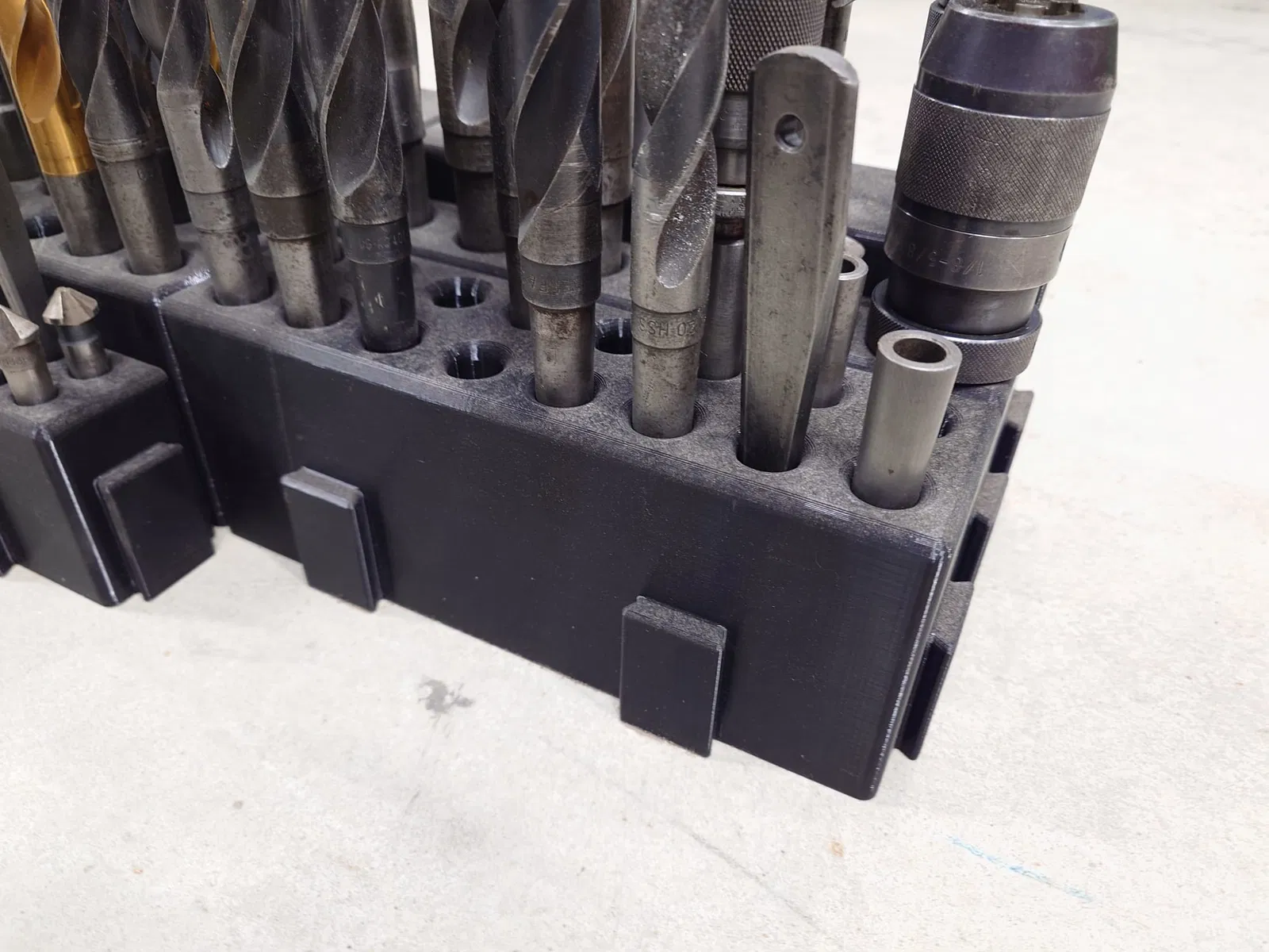 Vì không tìm được giá/khay giữ mũi khoan Morse taper phù hợp với nhu cầu, tụi mình đã thiết kế bộ drill rack dạng mô-đun có các khớp liên kết với nhau như sau: