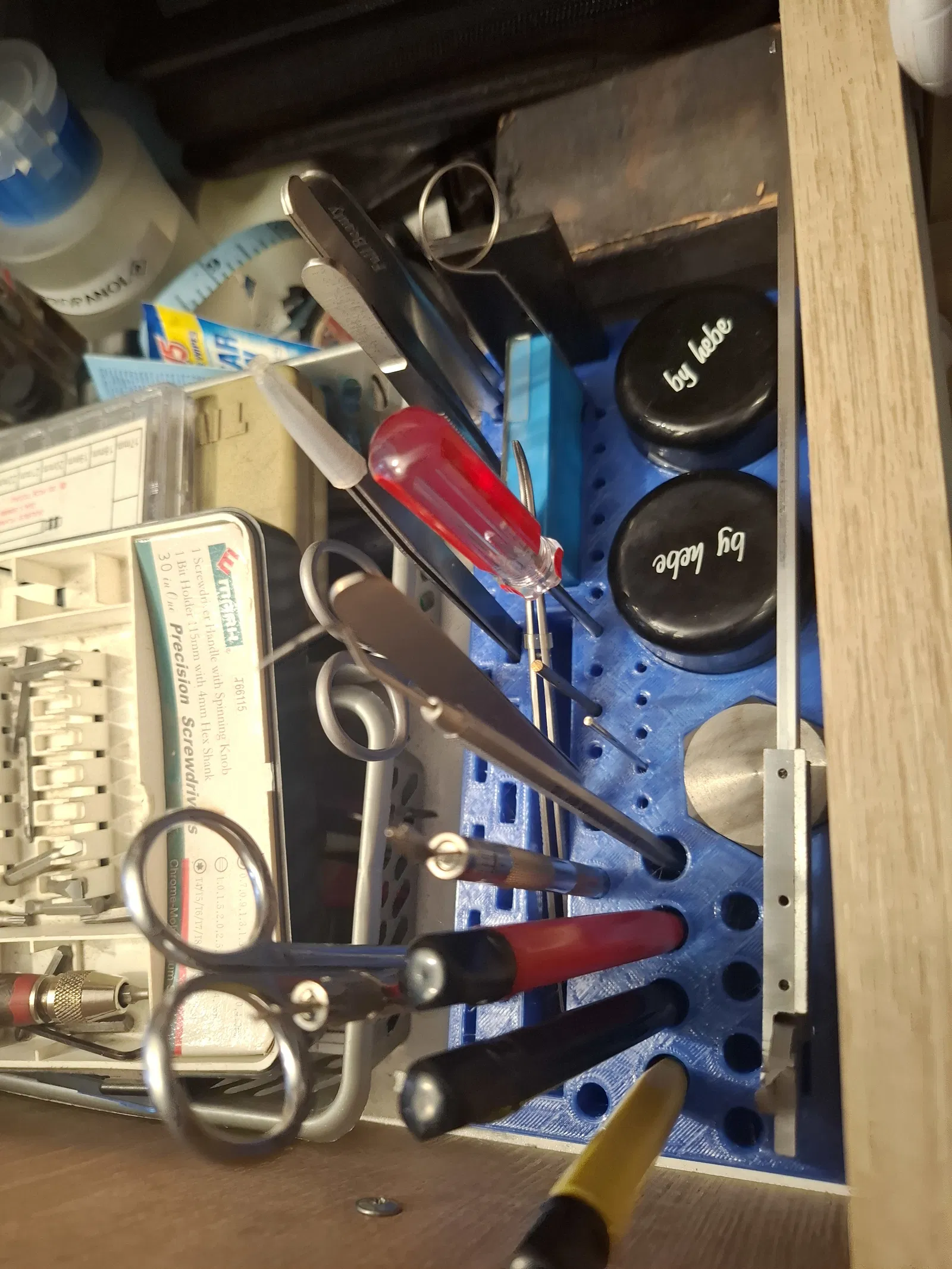 Giá đỡ/khay organizer tiện dụng cho thợ đồng hồ: dùng để cắm và sắp xếp dụng cụ, nhíp, lọ dầu cùng các vật dụng nhỏ khác, giúp bàn làm việc gọn gàng, dễ thao tác.