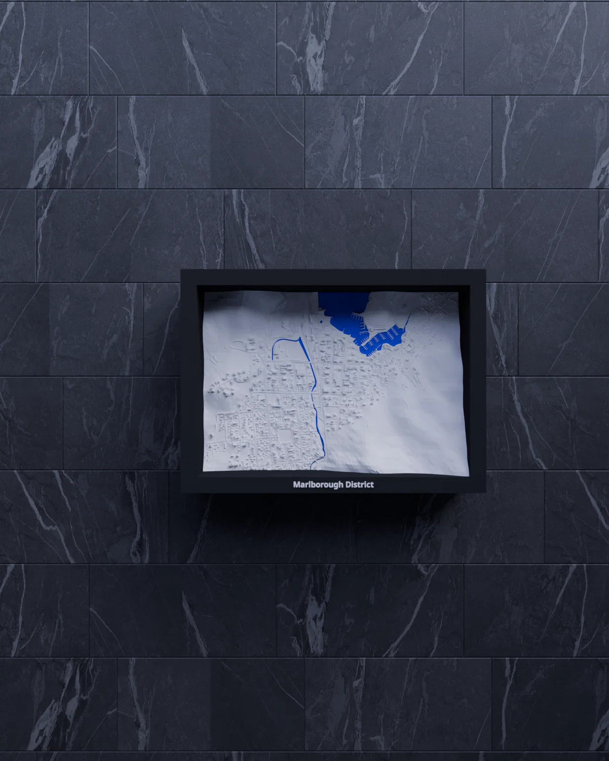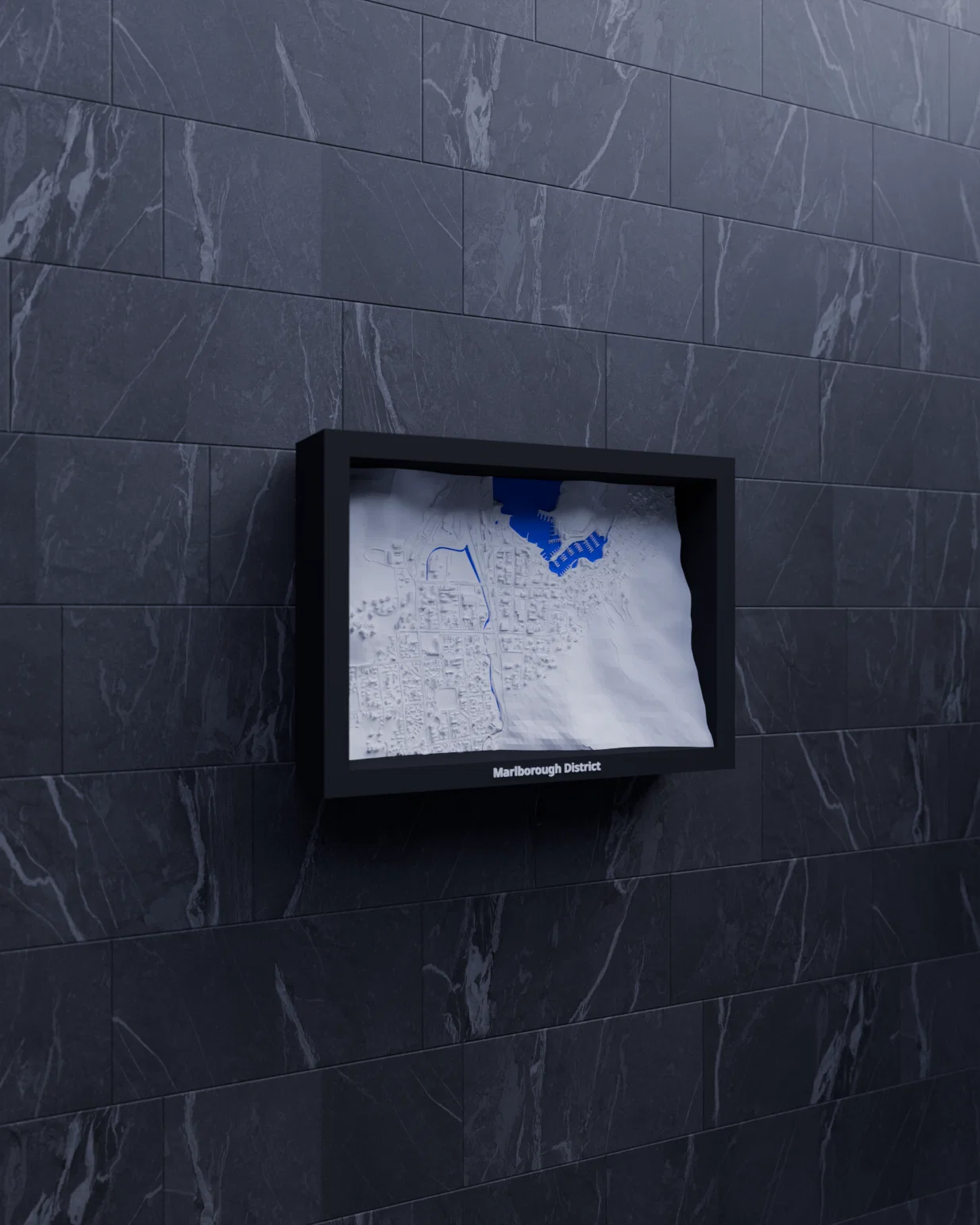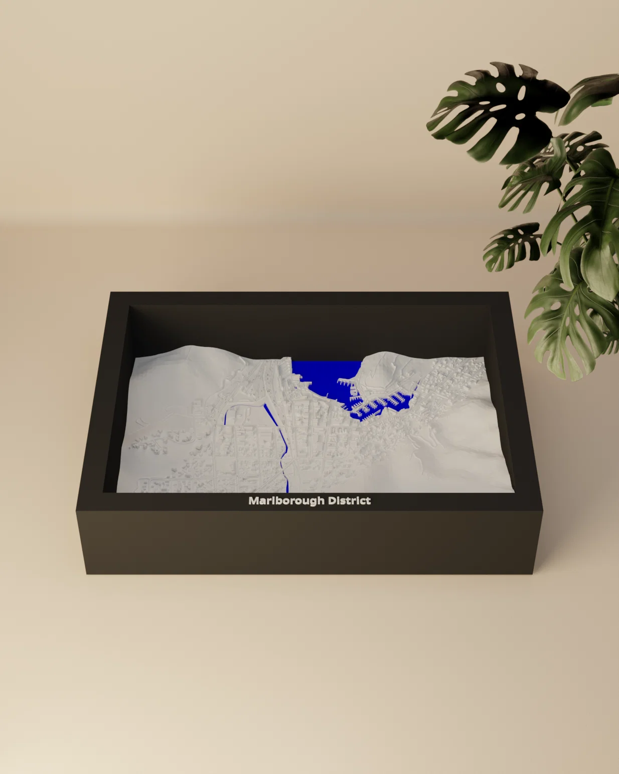 Mô hình địa hình thu nhỏ in 3D tái hiện Picton, New Zealand từ dữ liệu địa lý thực, tỷ lệ ~12016:1. Kích thước 170.5 × 119.5 mm, có nhiều lựa chọn frame kèm lỗ treo—phù hợp trưng bày, học tập hoặc làm quà tặng.