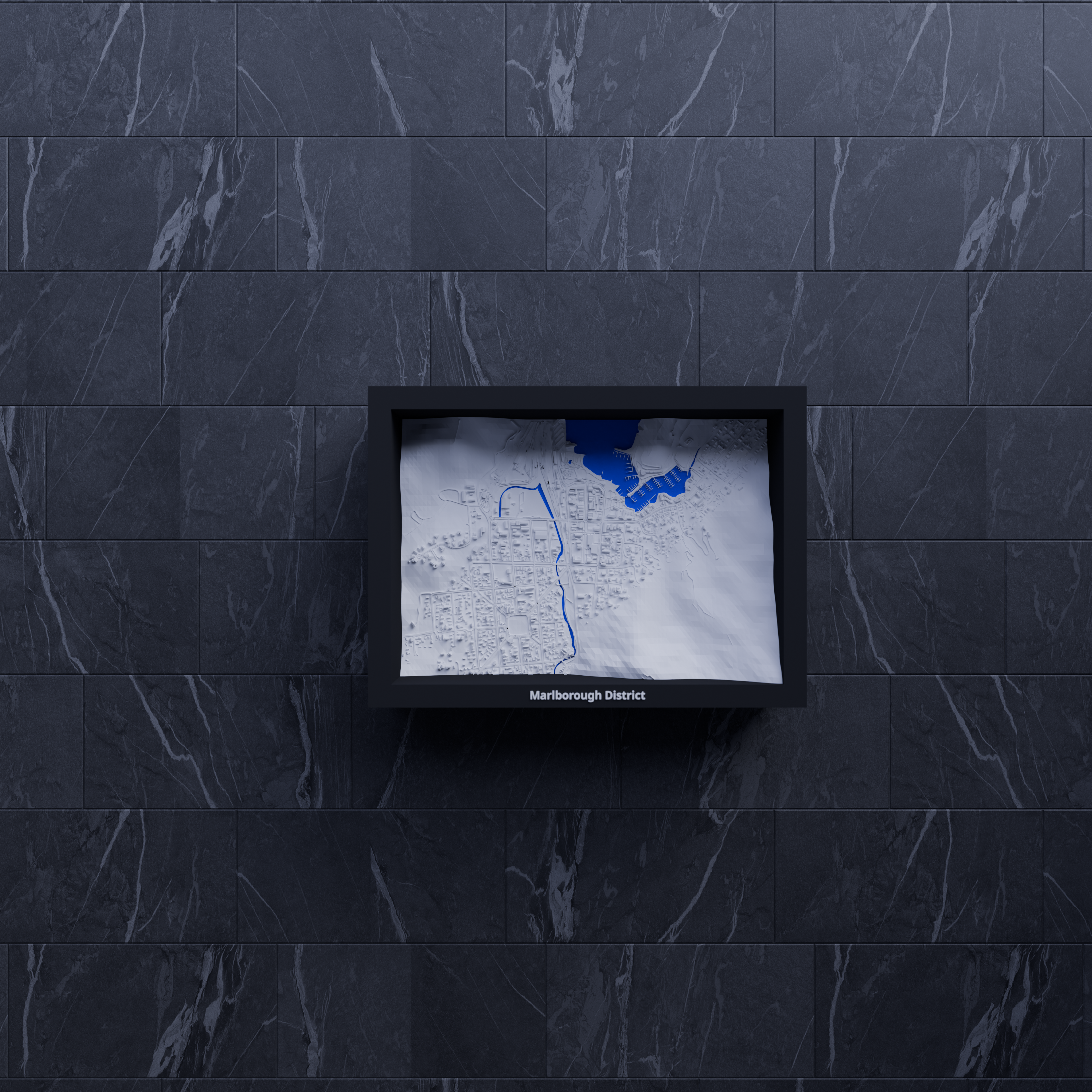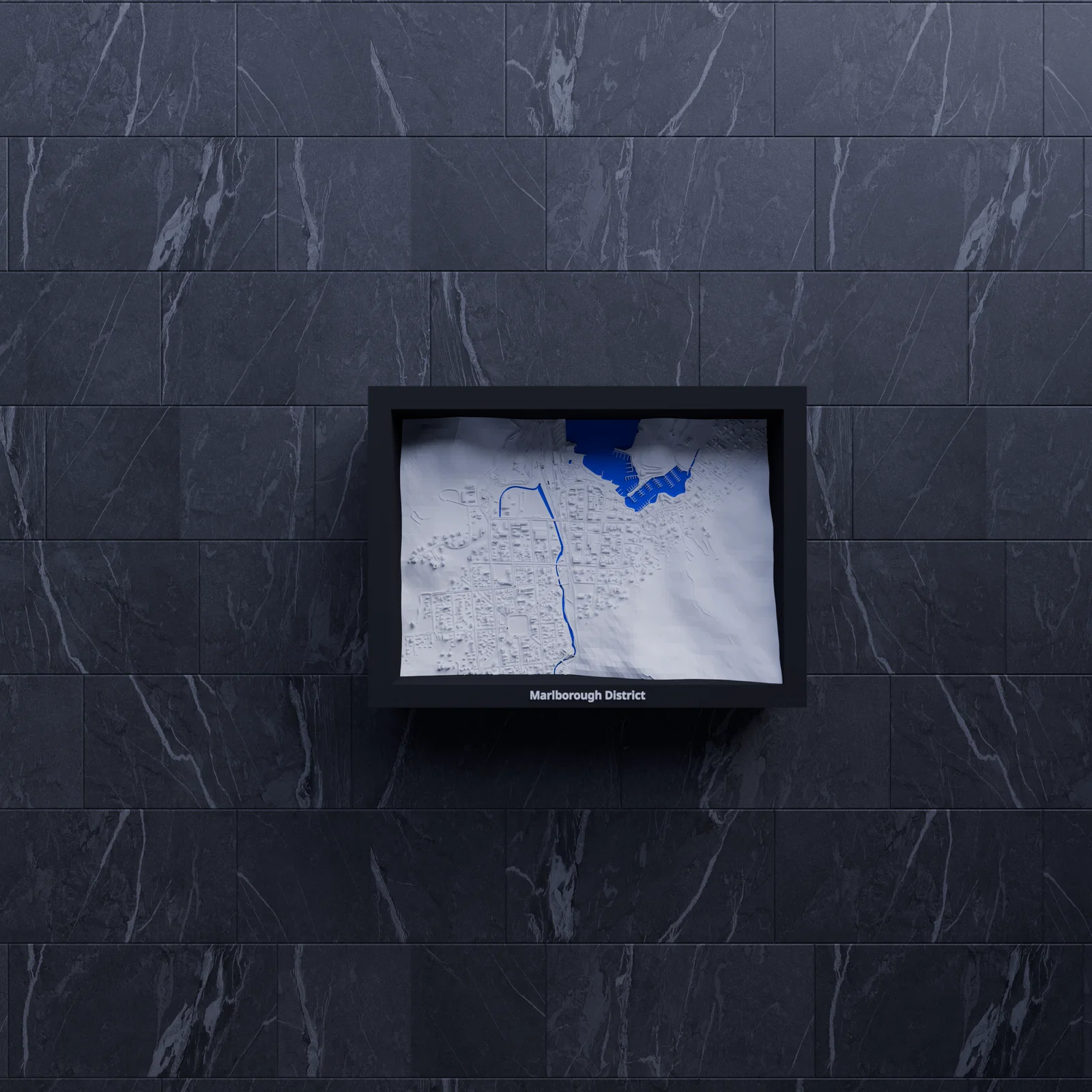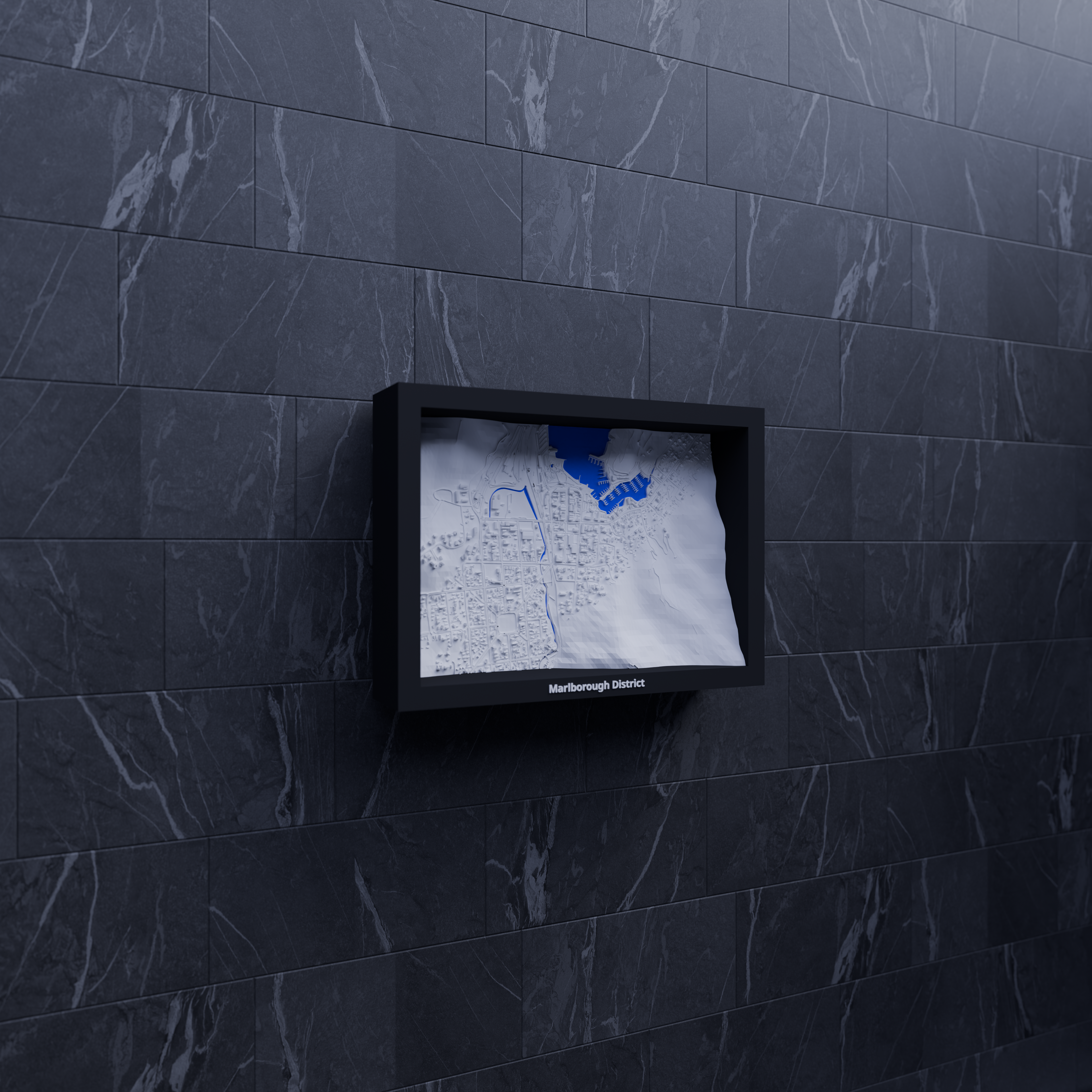 Mô hình địa hình thu nhỏ in 3D tái hiện Picton, New Zealand từ dữ liệu địa lý thực, tỷ lệ ~12016:1. Kích thước 170.5 × 119.5 mm, có nhiều lựa chọn frame kèm lỗ treo—phù hợp trưng bày, học tập hoặc làm quà tặng.