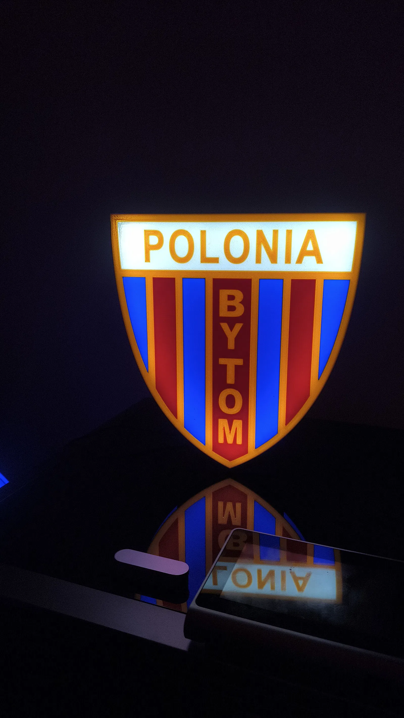 Lightbox của Polonia Bytom. Mặt trước làm bằng PLA, mặt sau bằng PETG. Mình khuyên là bên trong khung nên dán một dải LED Neutral (trung tính) chạy dọc theo mép. Mình in với thông số: layer height 0.2mm, infill 15%. Bật “Active material interlocking” trong phần cài đặt multi color.