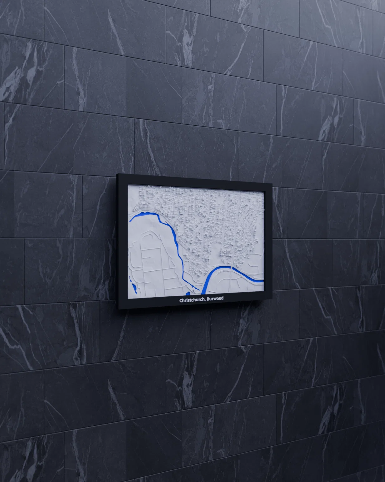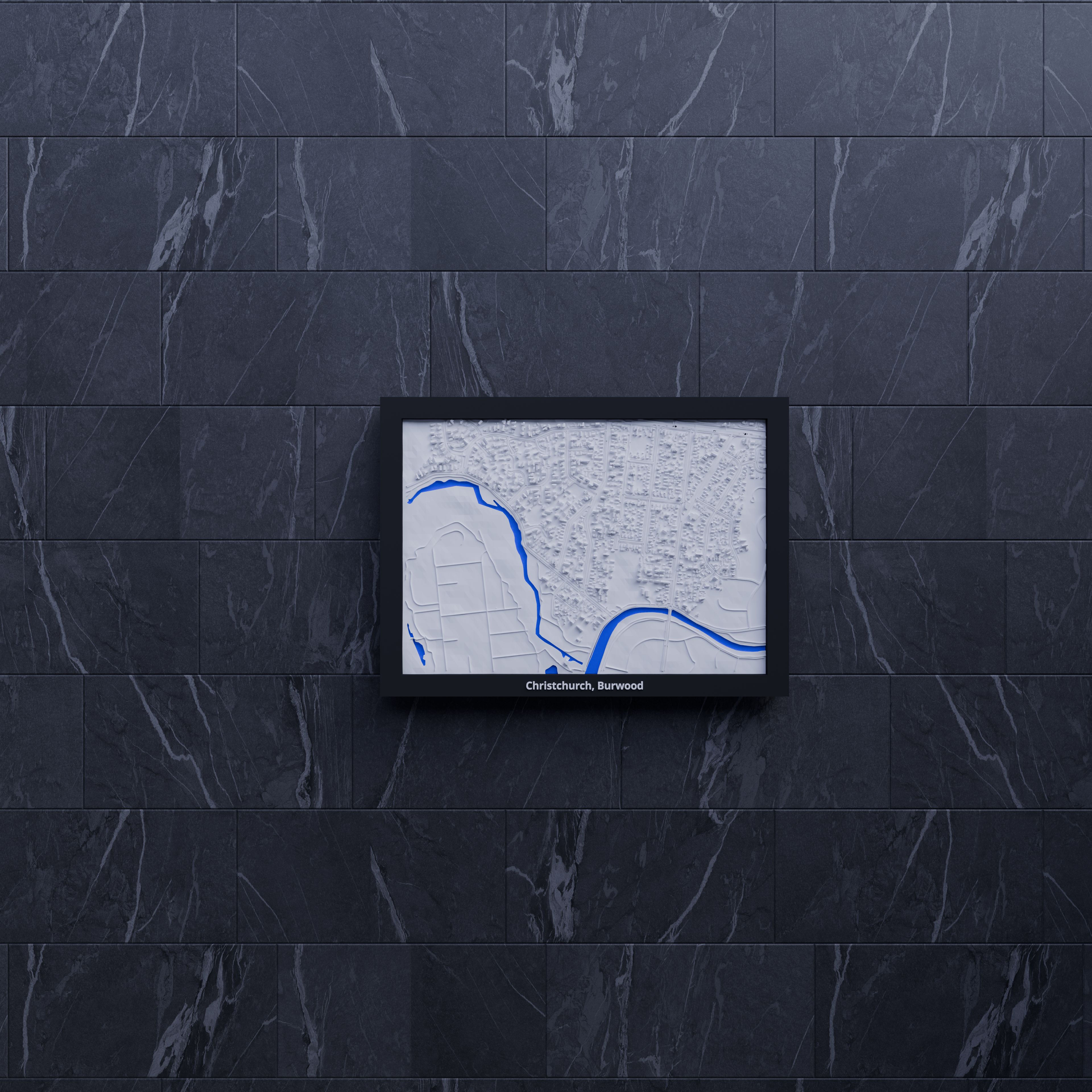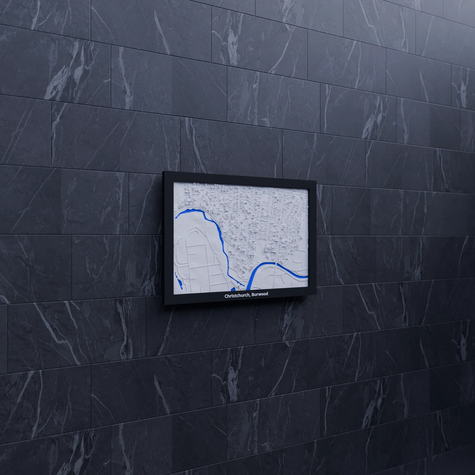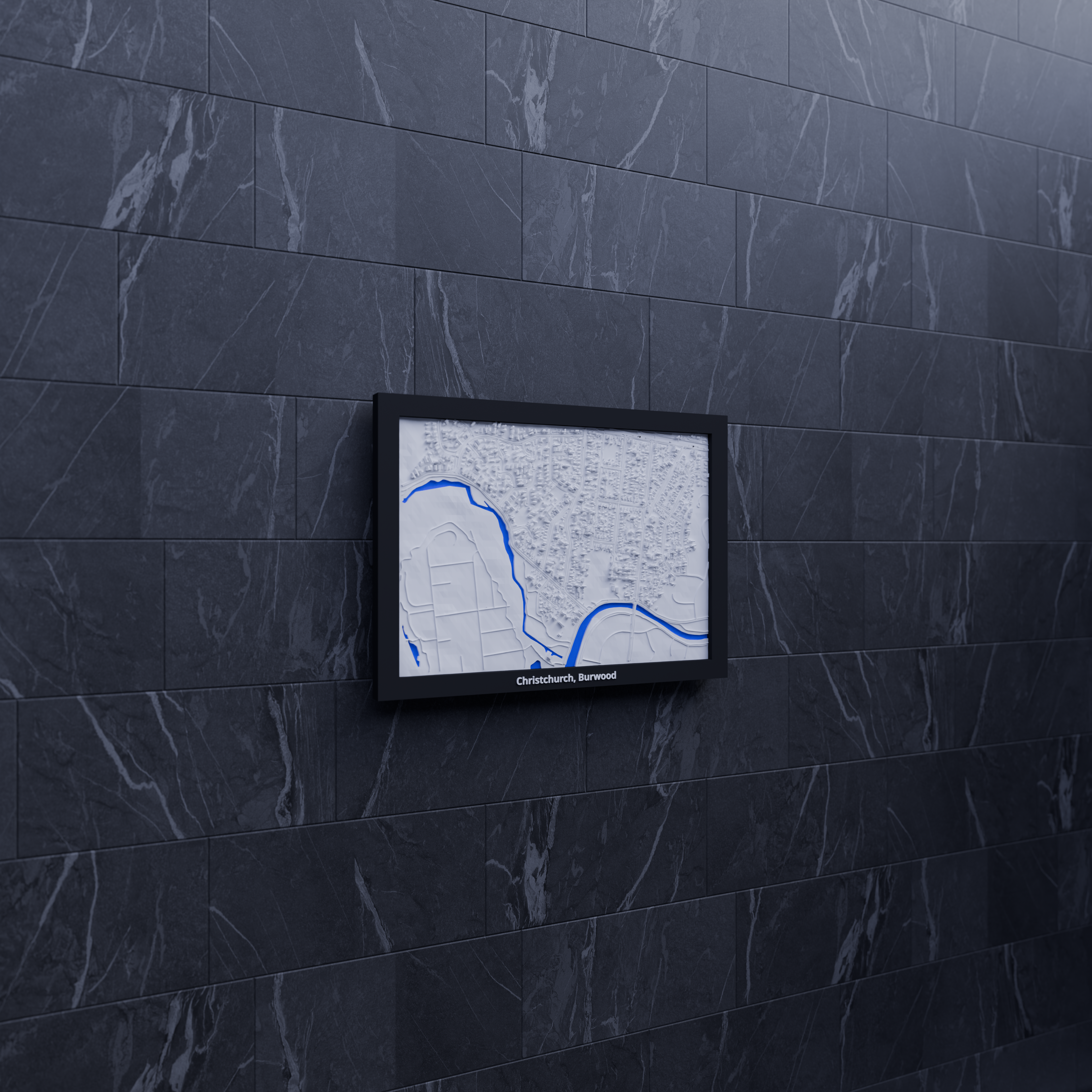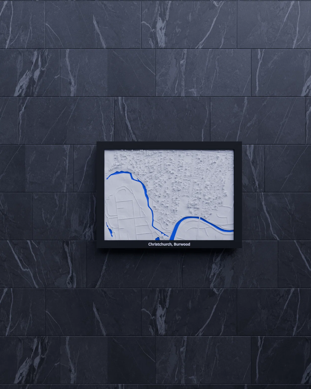 Bản thu nhỏ địa hình 3D của Christchurch, Burwood (New Zealand), dựng từ dữ liệu địa lý với tỷ lệ ~10015:1. Kèm nhiều frame có lỗ treo, có print profile multicolor/single color và hướng dẫn lắp ráp.