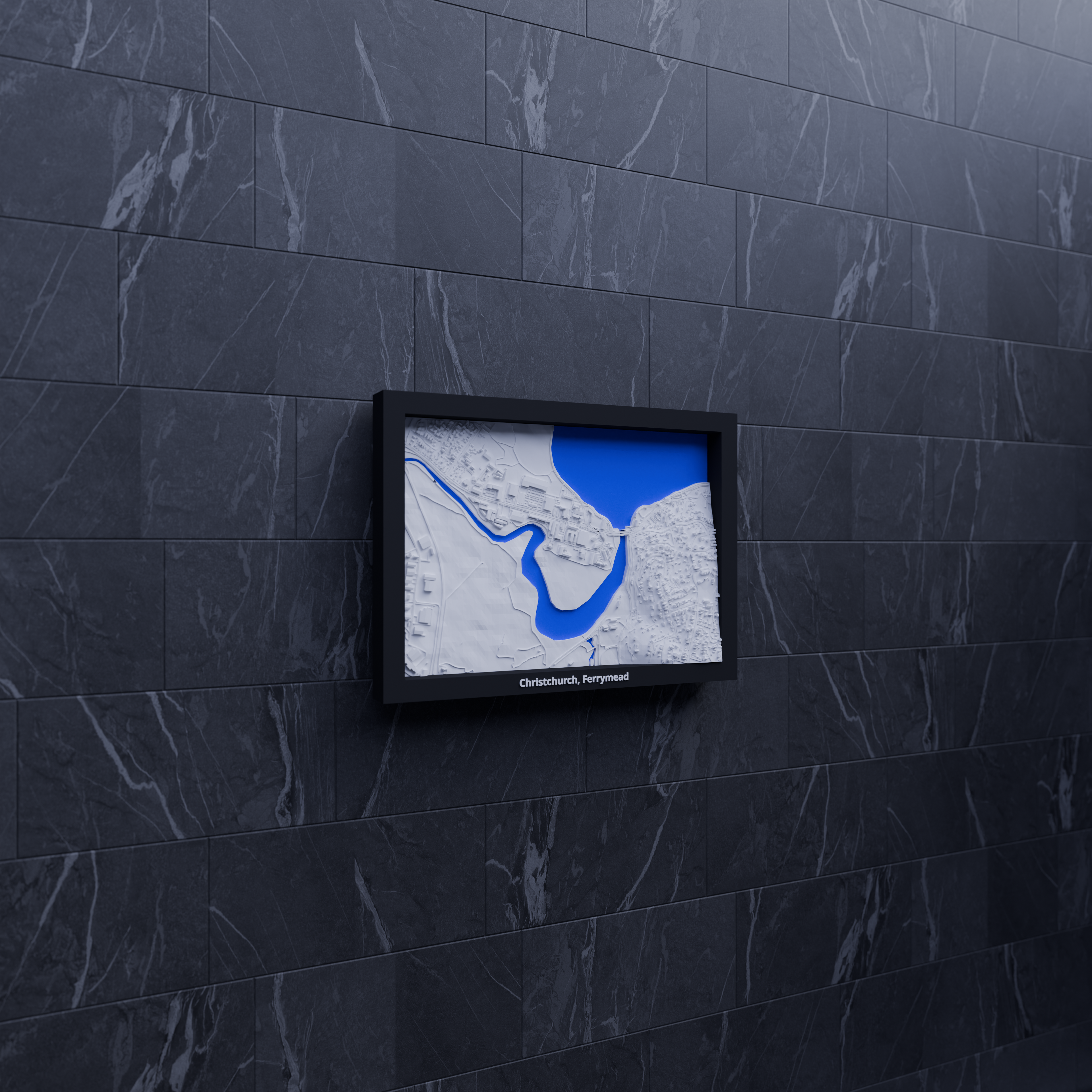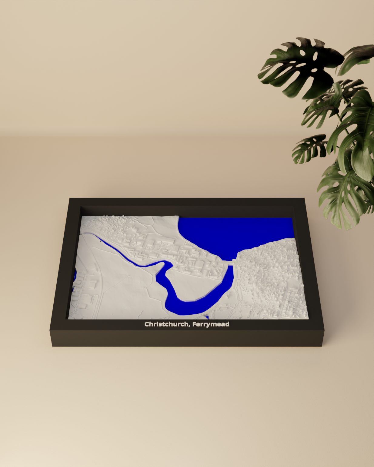 Mô hình thu nhỏ địa hình 3D tái hiện Christchurch, Ferrymead (New Zealand) từ dữ liệu địa lý, tỉ lệ ~12017:1, kích thước 170.5 × 119.5 mm. Phù hợp trưng bày, giáo dục, trực quan hóa kiến trúc, có frame kèm lỗ treo.
