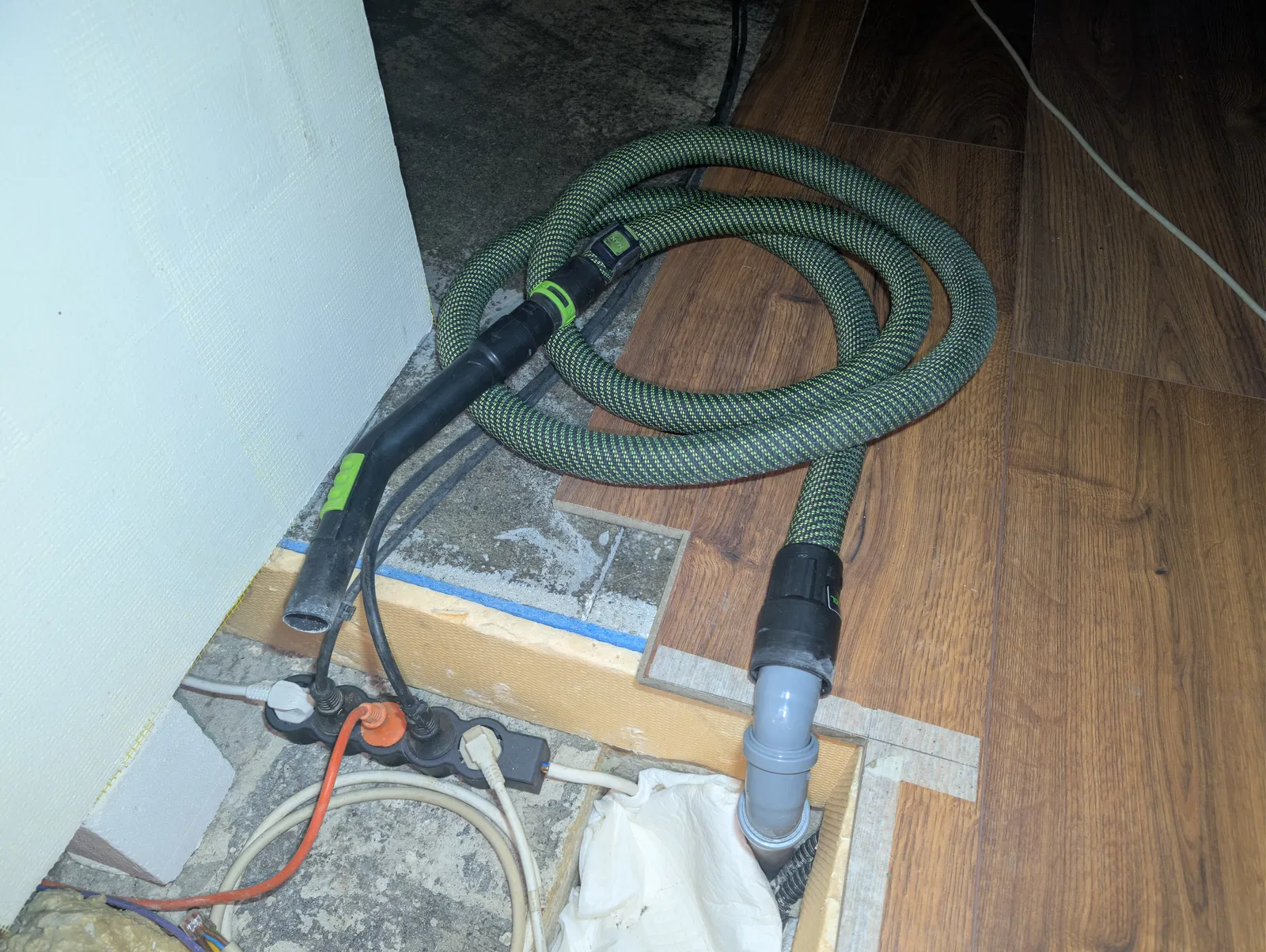 Adapter giúp nối ống nước PVC xoắn 38mm vào ống hút bụi Festool. Có thể kết hợp với ống PVC 40mm để kéo dài tầm với, dùng ống cứng đi xuyên tường/trần và ống mềm ở hai đầu; cần kín hơn thì thêm notch/ren hoặc quấn duct tape.