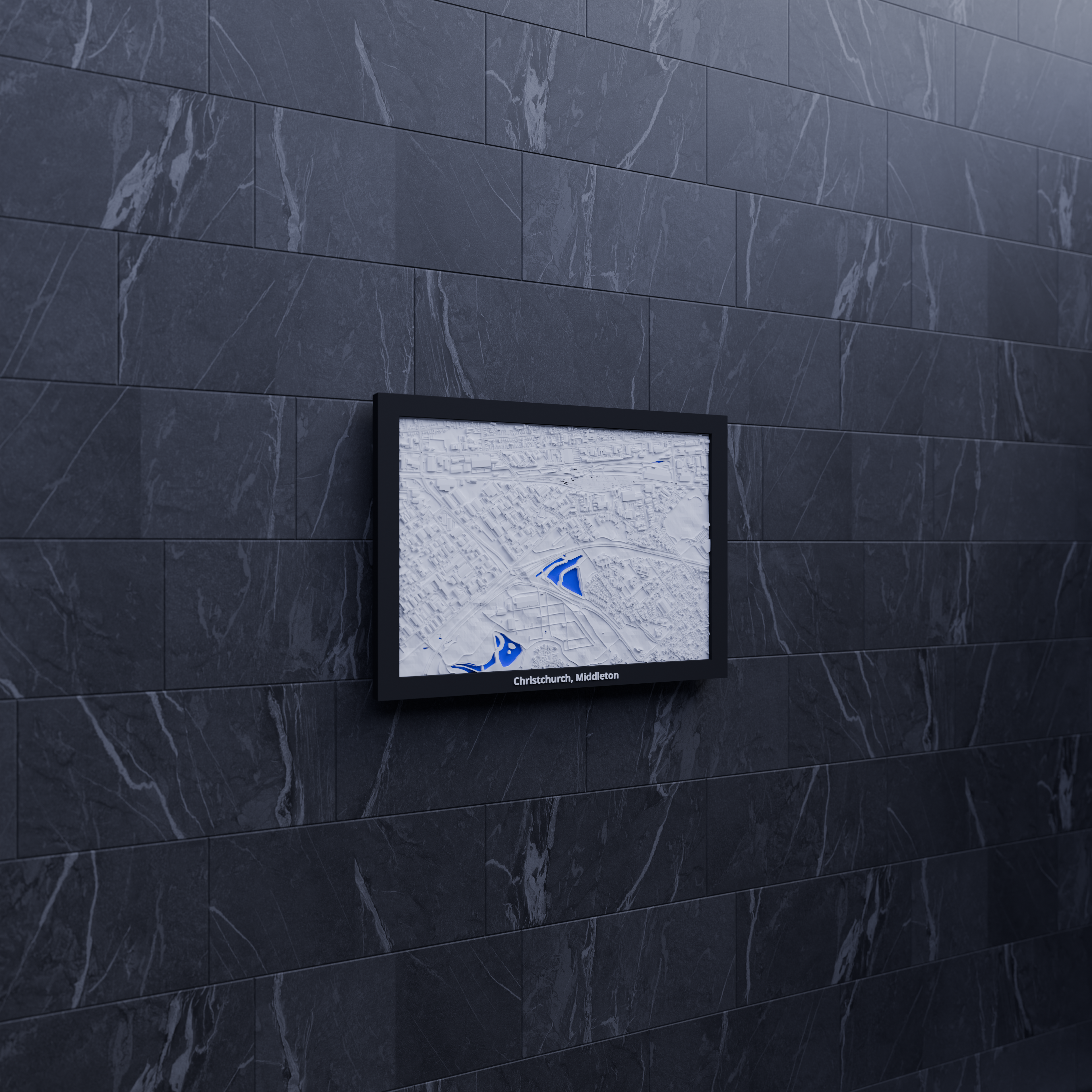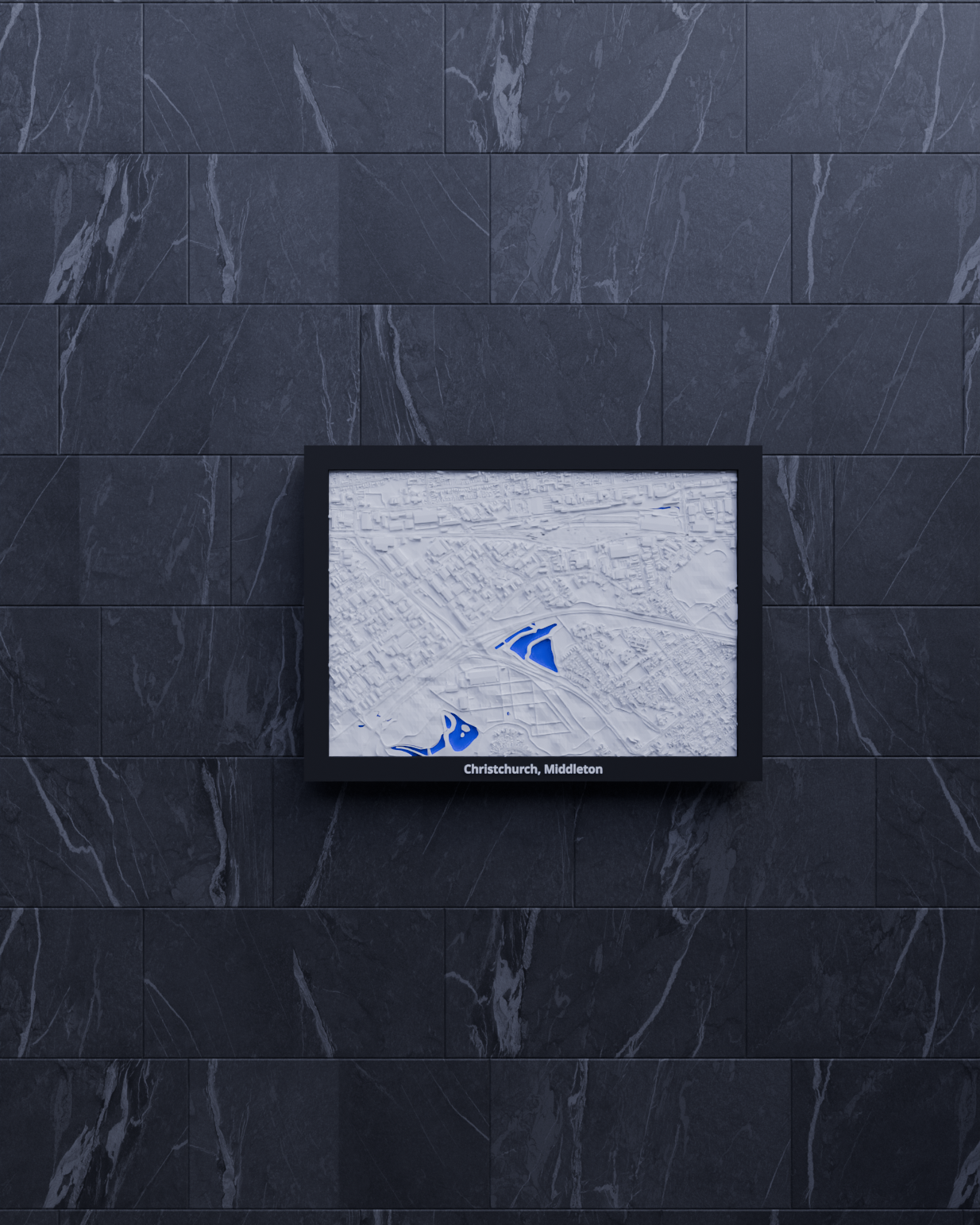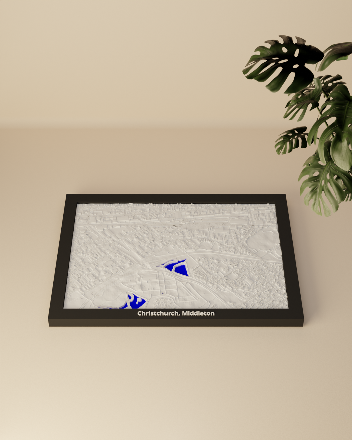 Mô hình địa hình thu nhỏ in 3D tái hiện khu vực Christchurch, Middleton (New Zealand) từ dữ liệu địa lý. Có nhiều frame kèm lỗ treo, phù hợp trưng bày, học tập, và làm quà tặng.