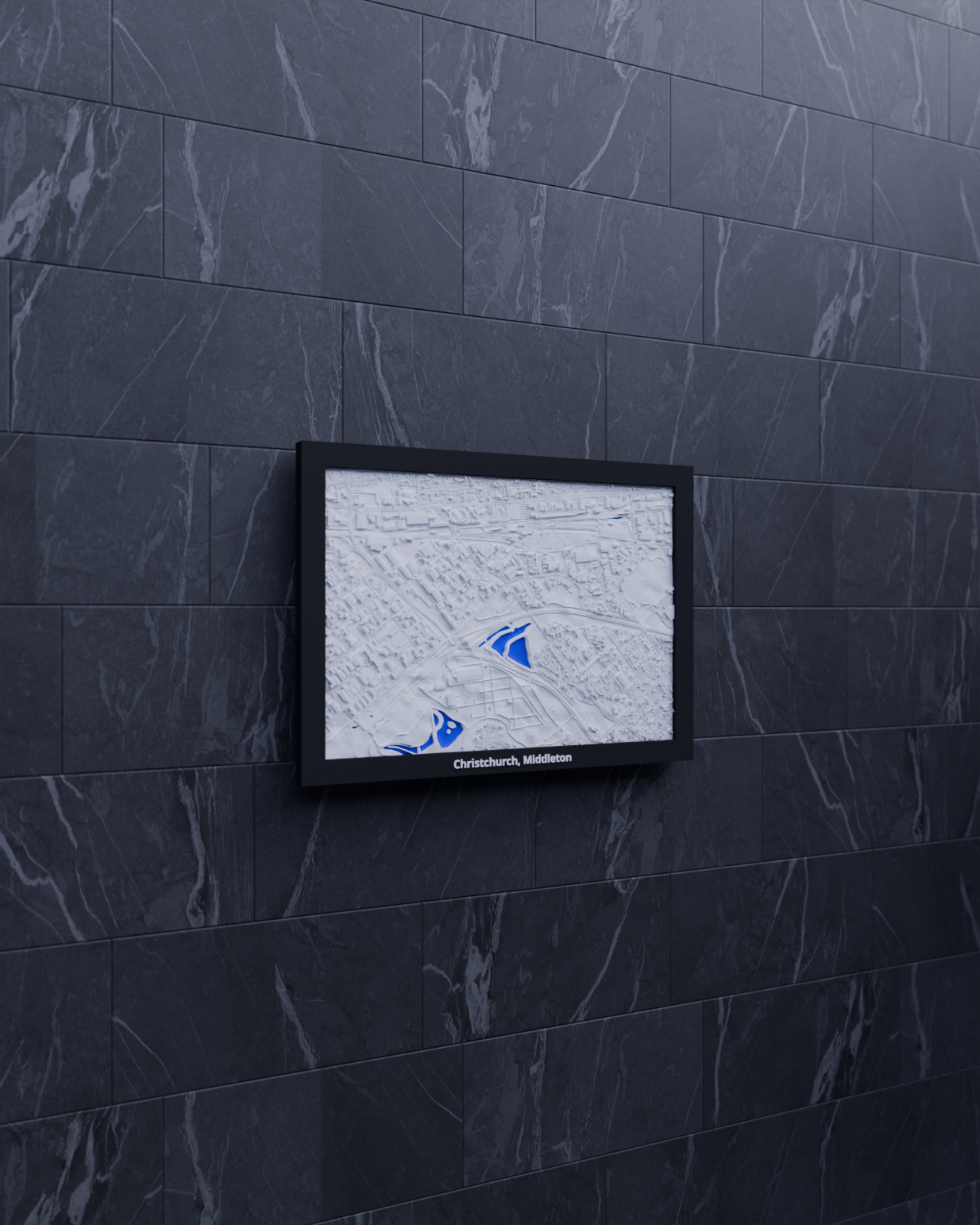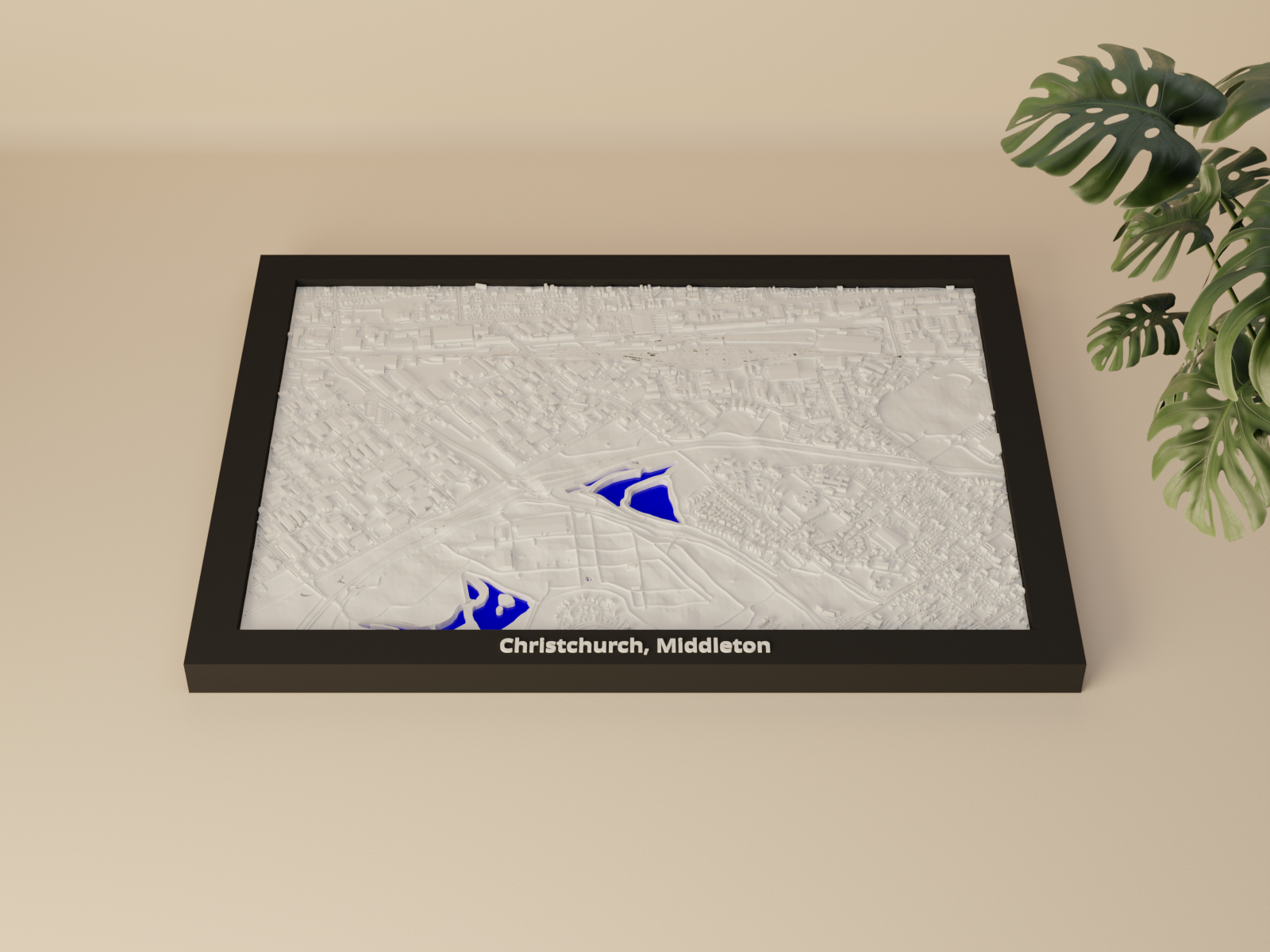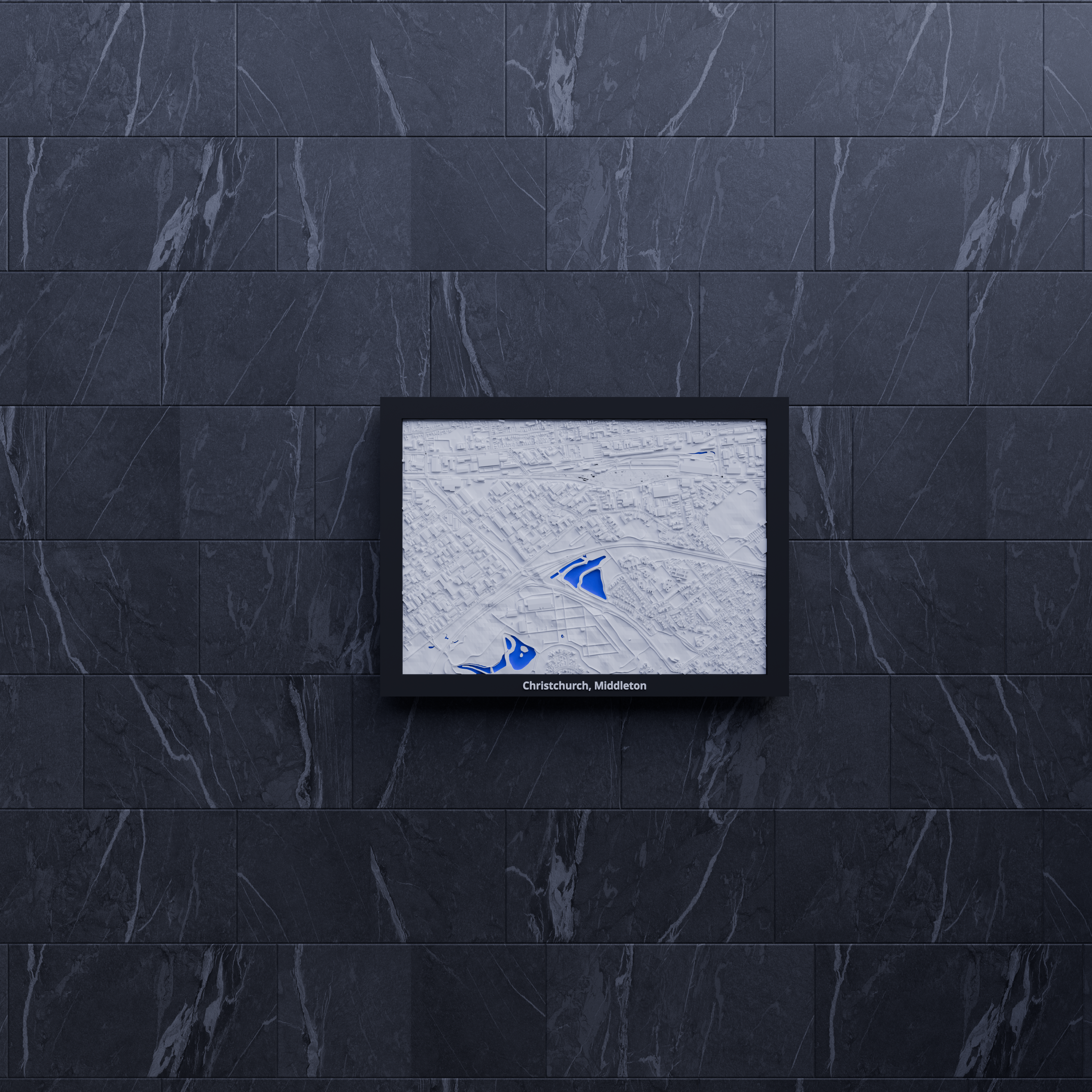 Mô hình địa hình thu nhỏ in 3D tái hiện khu vực Christchurch, Middleton (New Zealand) từ dữ liệu địa lý. Có nhiều frame kèm lỗ treo, phù hợp trưng bày, học tập, và làm quà tặng.