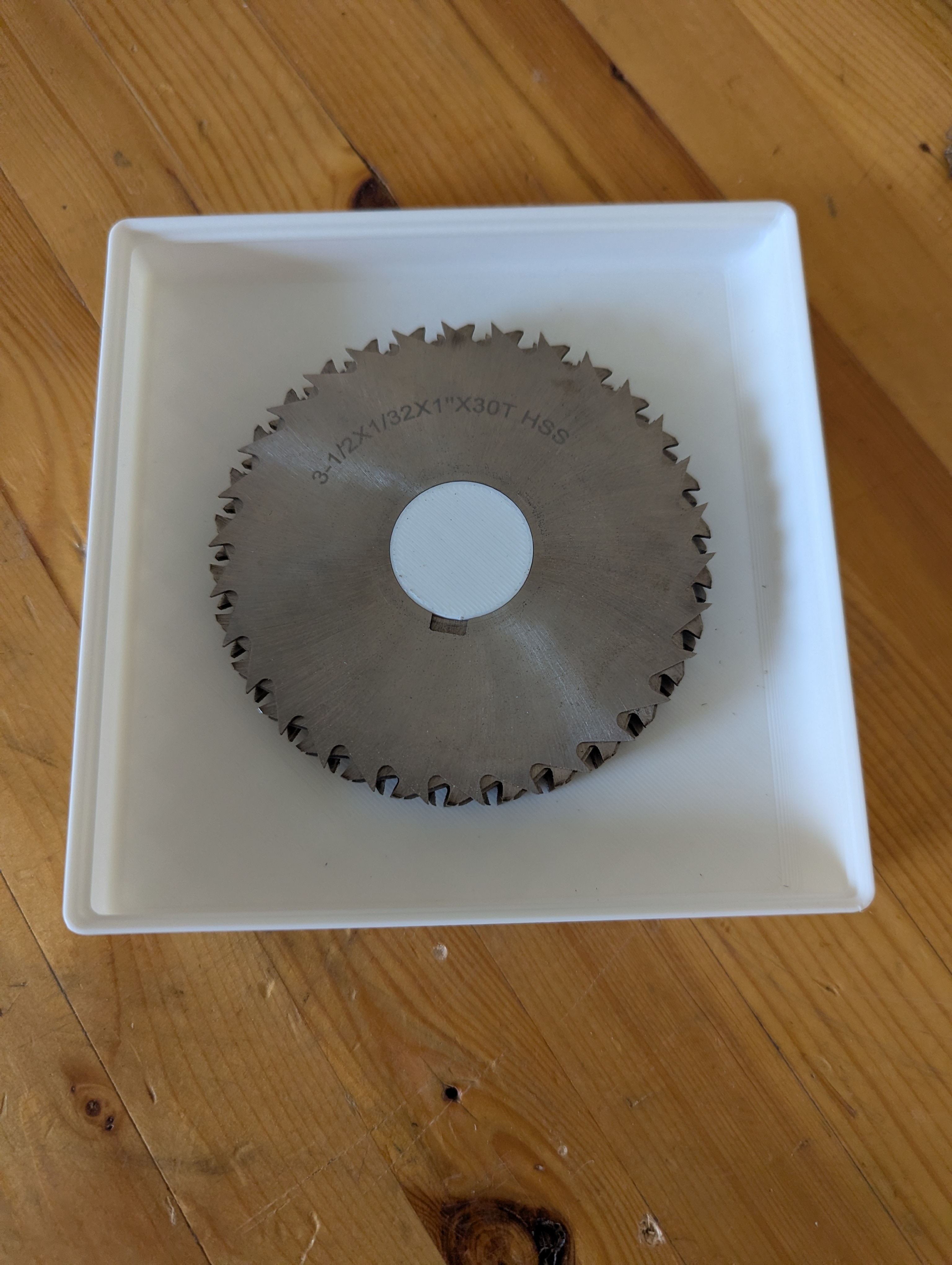 Khay Gridfinity dạng mỏng, xếp chồng được để cất metal slotting saw blades. Hỗ trợ lỗ arbor 1in/25mm và chứa lưỡi đường kính tối đa khoảng 4.75in. Dựa trên bin tray chuẩn của Gridfinity.