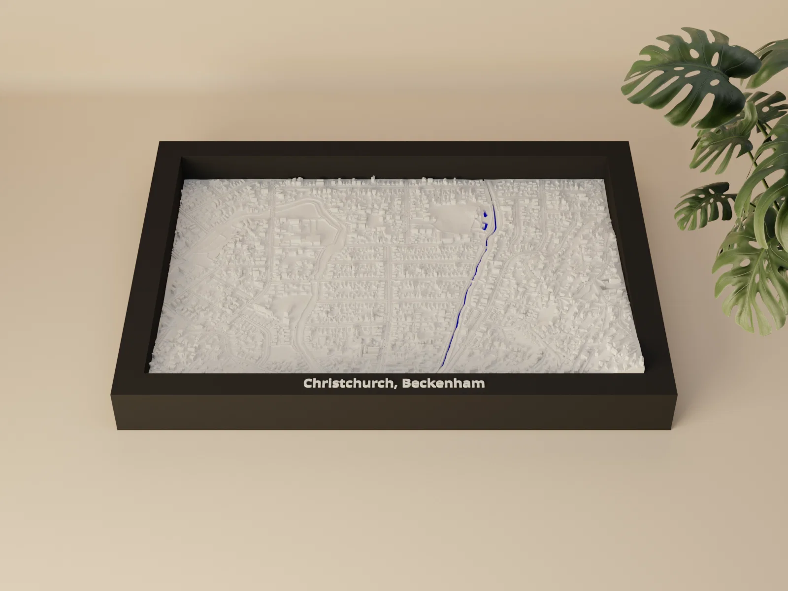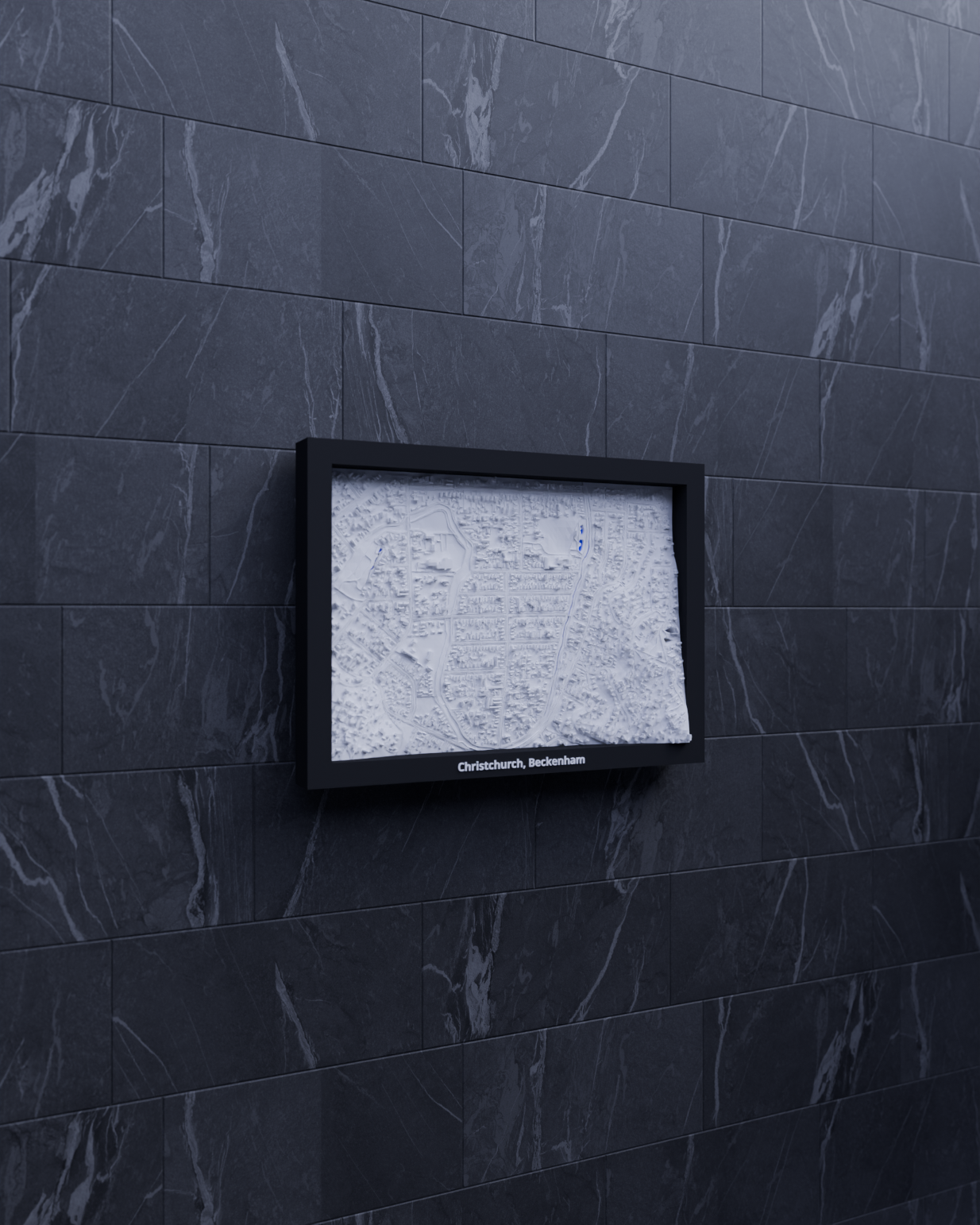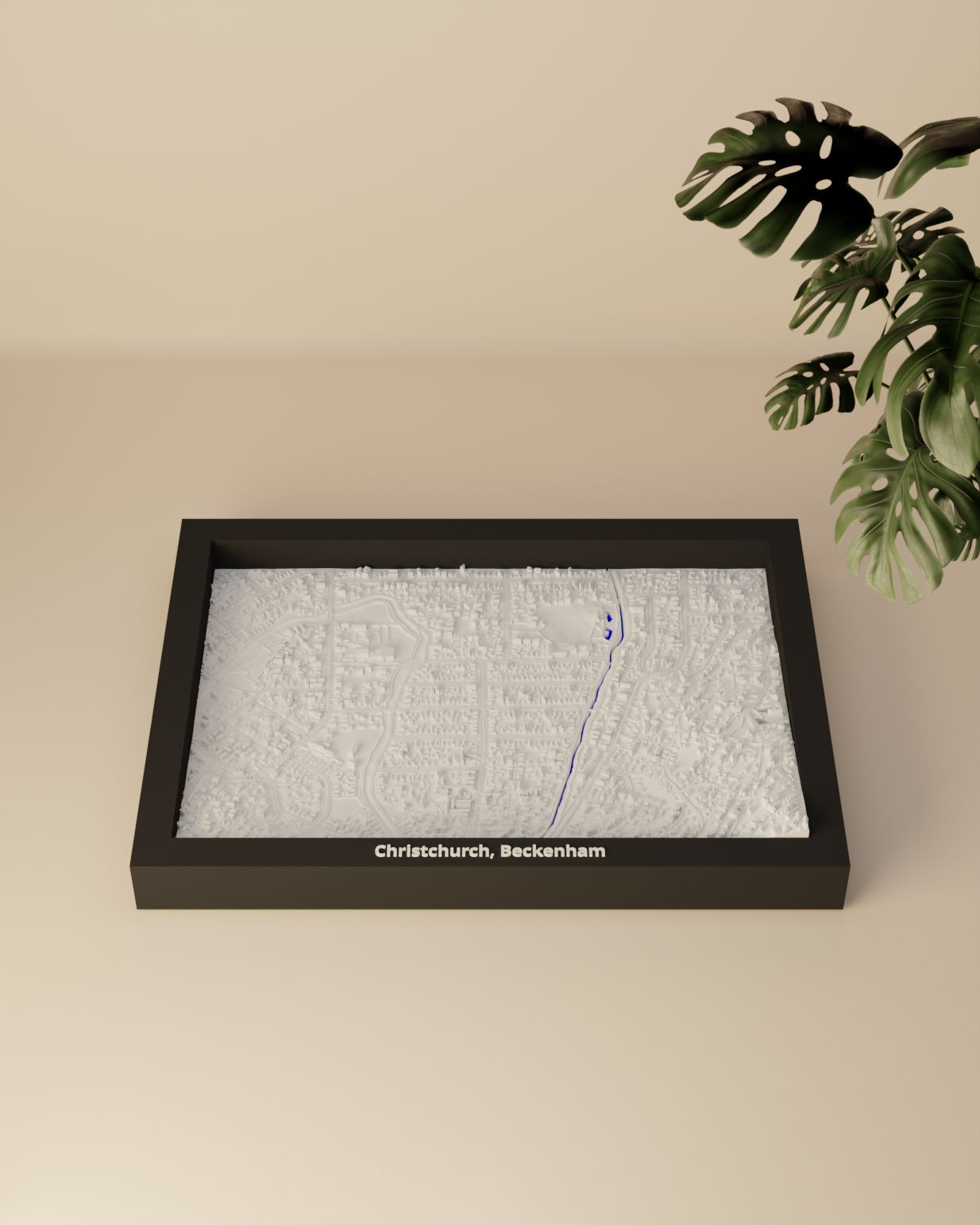 Miniature địa hình in 3D tái hiện Christchurch, Beckenham (New Zealand) từ dữ liệu địa lý, kích thước 170.5 × 119.5 mm, tỷ lệ ~10015:1. Có nhiều frame kèm lỗ treo, phù hợp trưng bày hoặc học tập.
