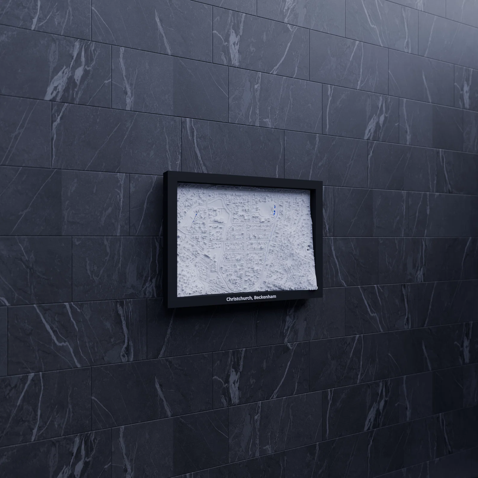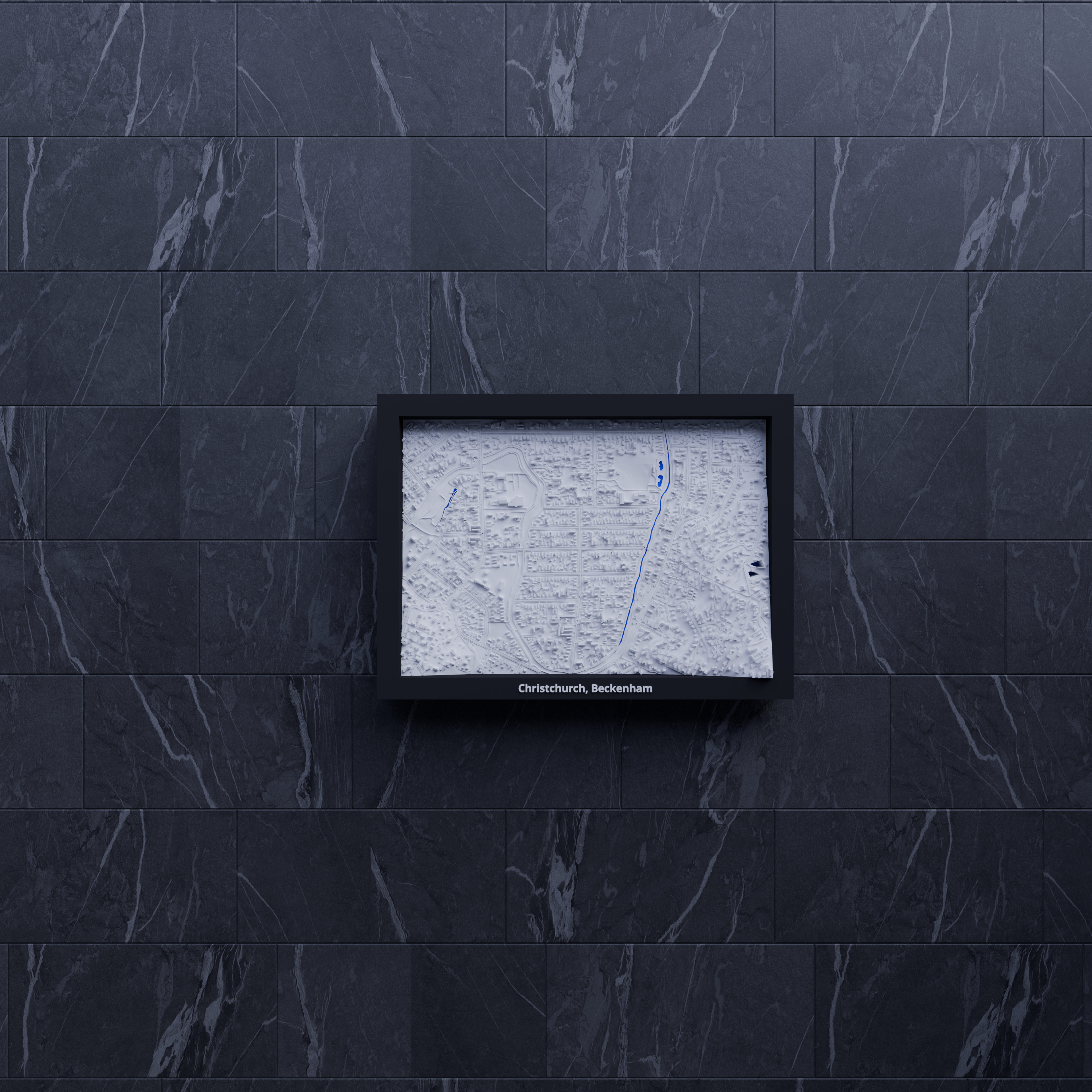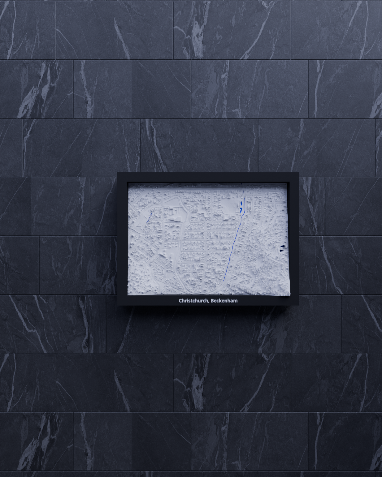 Miniature địa hình in 3D tái hiện Christchurch, Beckenham (New Zealand) từ dữ liệu địa lý, kích thước 170.5 × 119.5 mm, tỷ lệ ~10015:1. Có nhiều frame kèm lỗ treo, phù hợp trưng bày hoặc học tập.