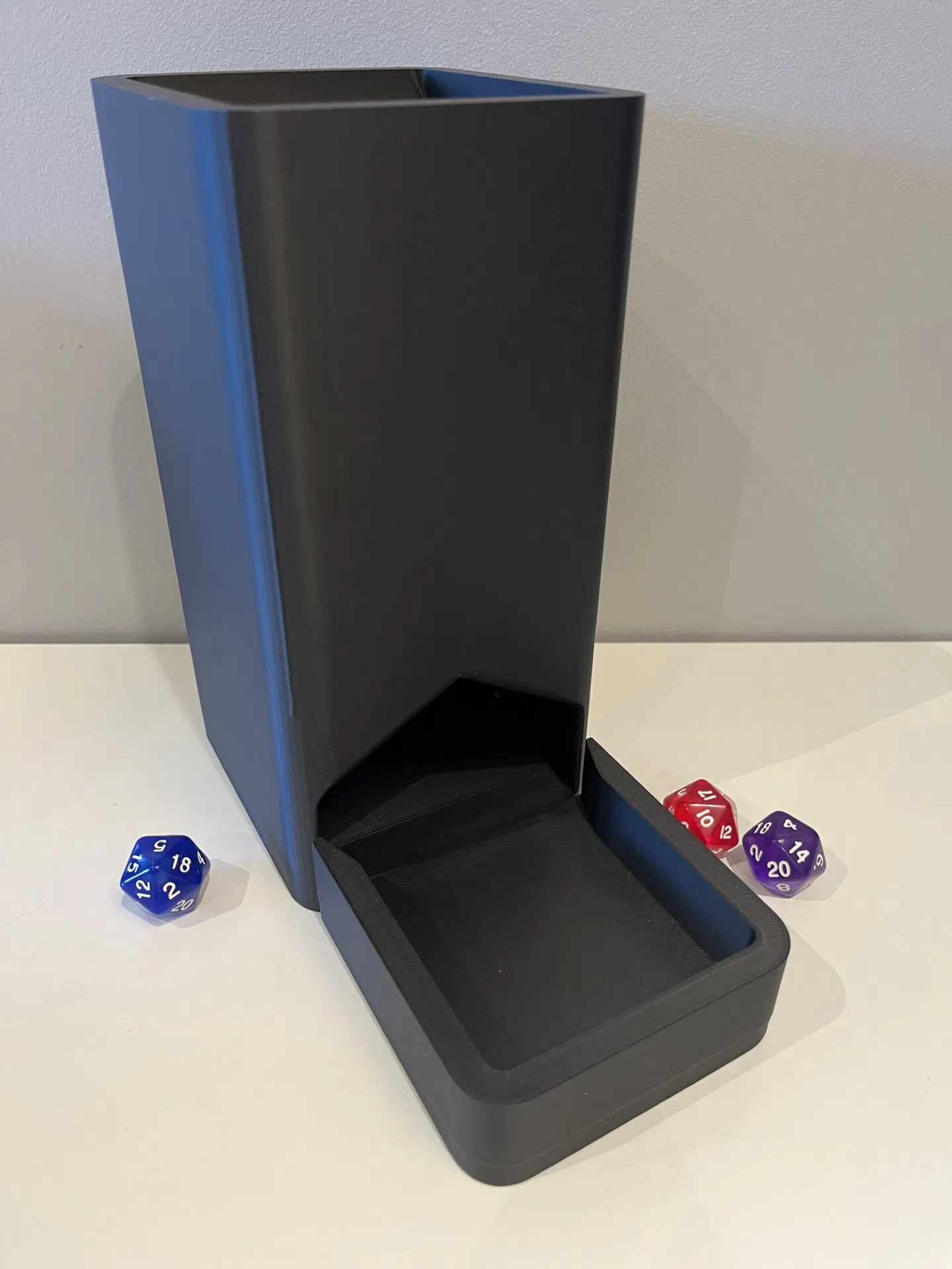 Tháp thả xúc xắc (Full Size) phong cách tối giản cho D&D và các boardgame. Hỗ trợ thả nhiều viên cùng lúc; khay hứng tháo rời để cất gọn và có thể gắn khay vào bên hông khi lưu trữ.