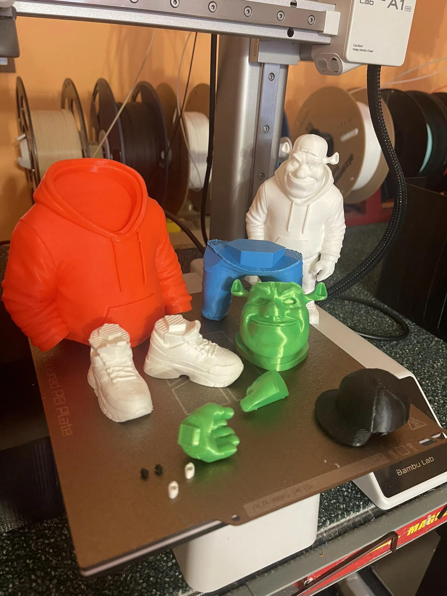 Urban Vibe Shrek cao 21 cm với hoodie oversize, nón đội ngược và sneakers. File tách màu, in FDM tiêu chuẩn không cần MMU/noAMS. Có 3MF sắp plate sẵn và STL từng phần, lắp bằng keo 502 dễ dàng.