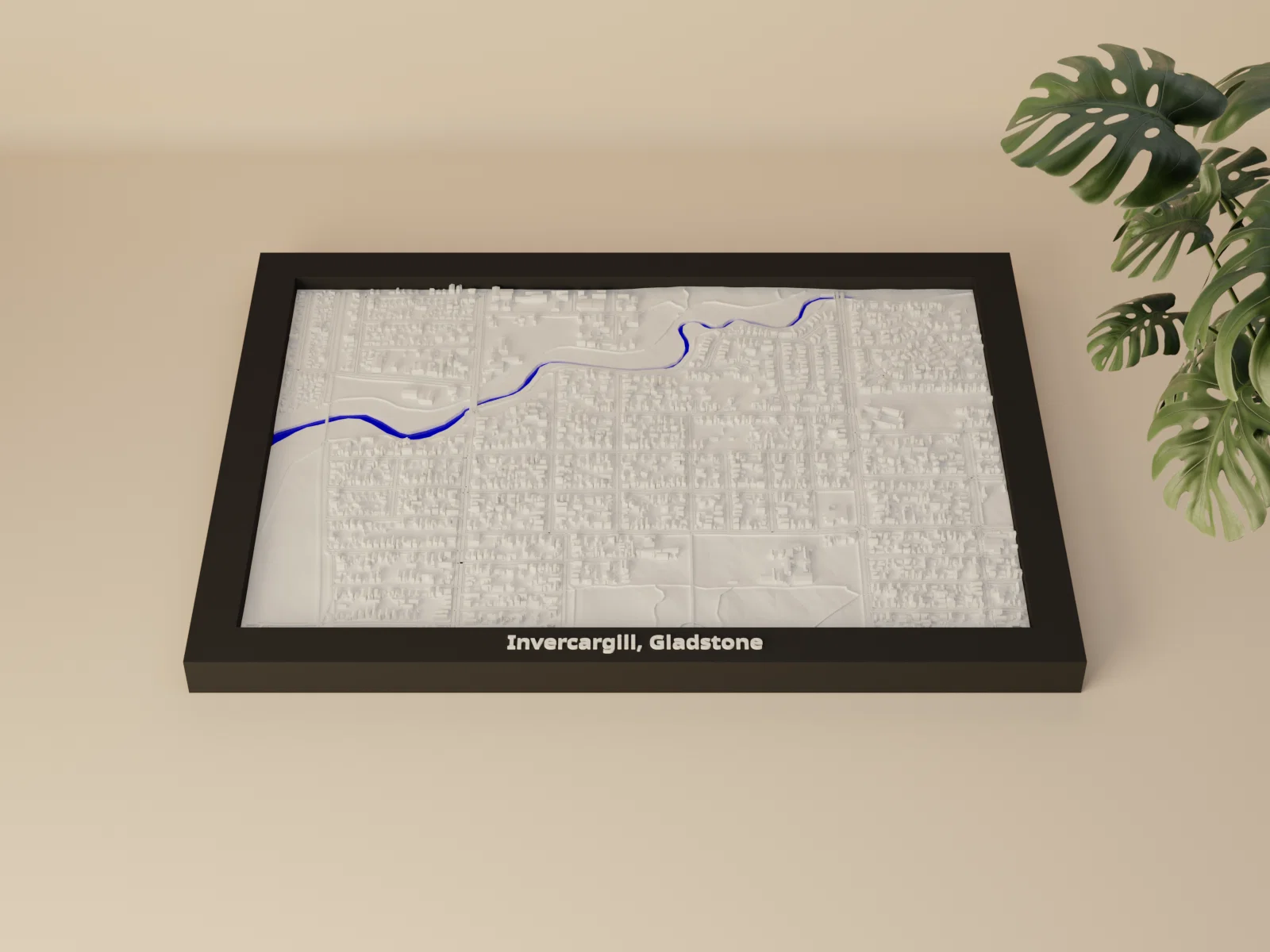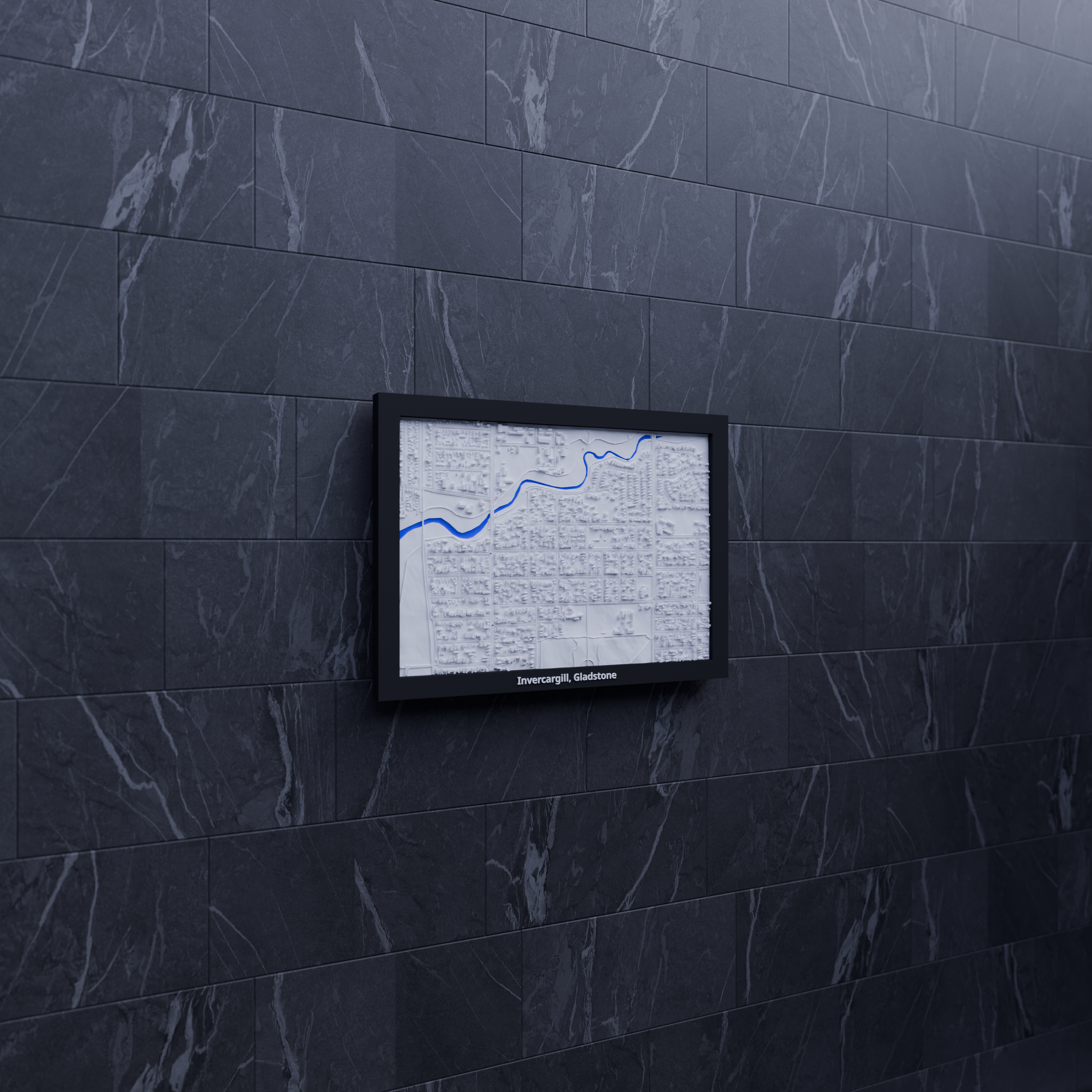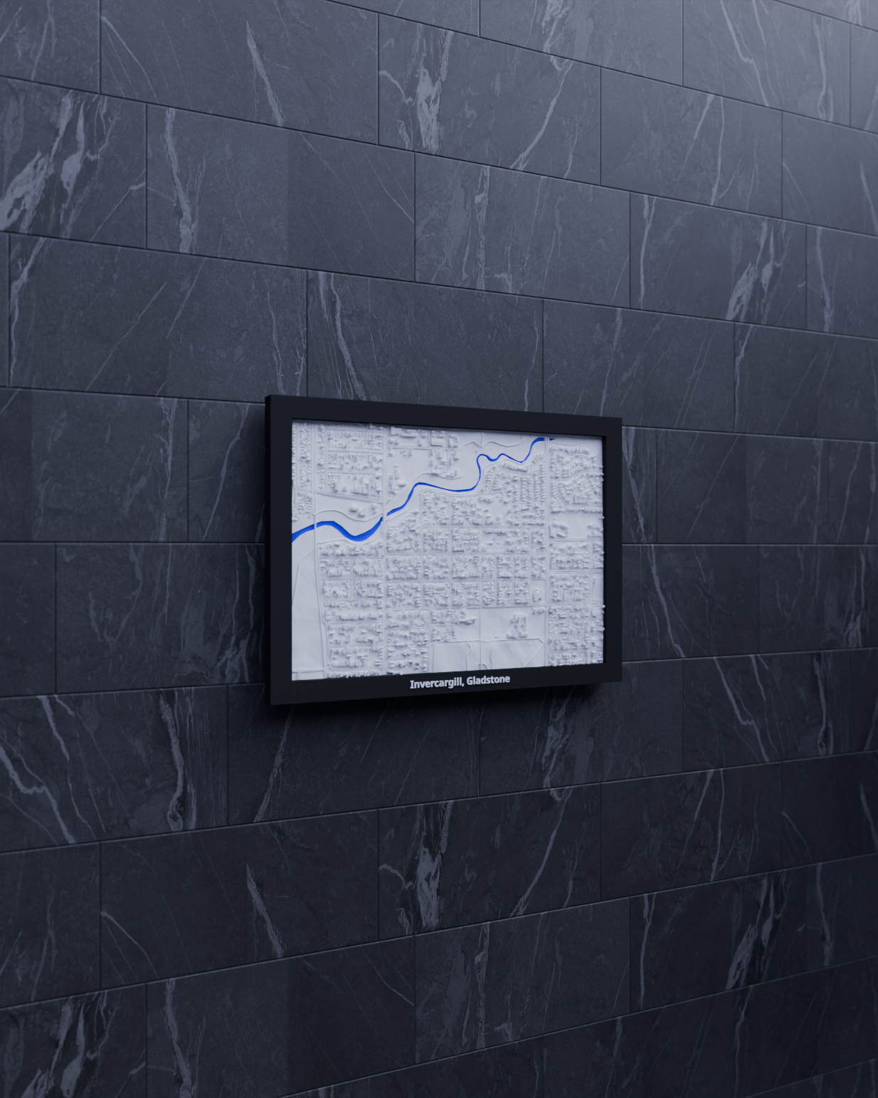 Mô hình thu nhỏ địa hình 3D của Invercargill, Gladstone (New Zealand), dựng từ dữ liệu địa lý để tái hiện terrain chân thực. Có khung kèm theo, hỗ trợ in multicolor/single color và tùy chọn profile “arachne”.