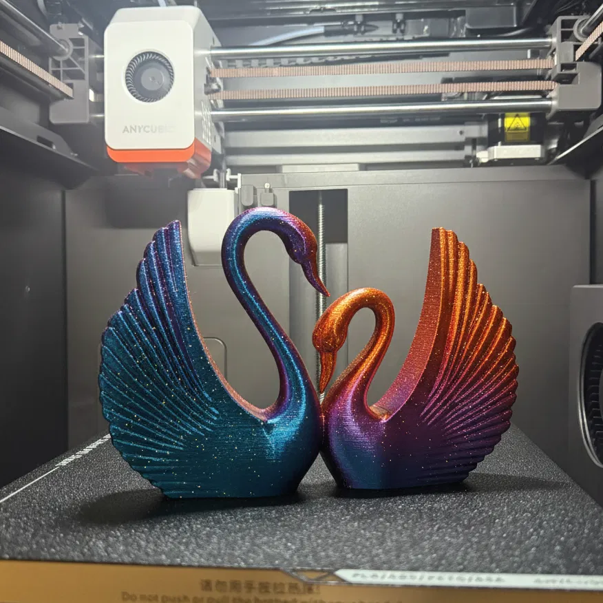 Thêm chút sang trọng cổ điển cho không gian của bạn với “Majestic Grace”. Tác phẩm điêu khắc 3D có thể in này khắc họa một cặp thiên nga với đôi cánh độc đáo dạng nan quạt, xòe ra như vỏ sò. Chất bề mặt và dáng tạo hình gợi cảm giác như một tượng Art Deco cao cấp, rất hợp làm điểm nhấn trung tâm trên kệ lò sưởi, kệ sách hoặc bàn tiệc cưới.