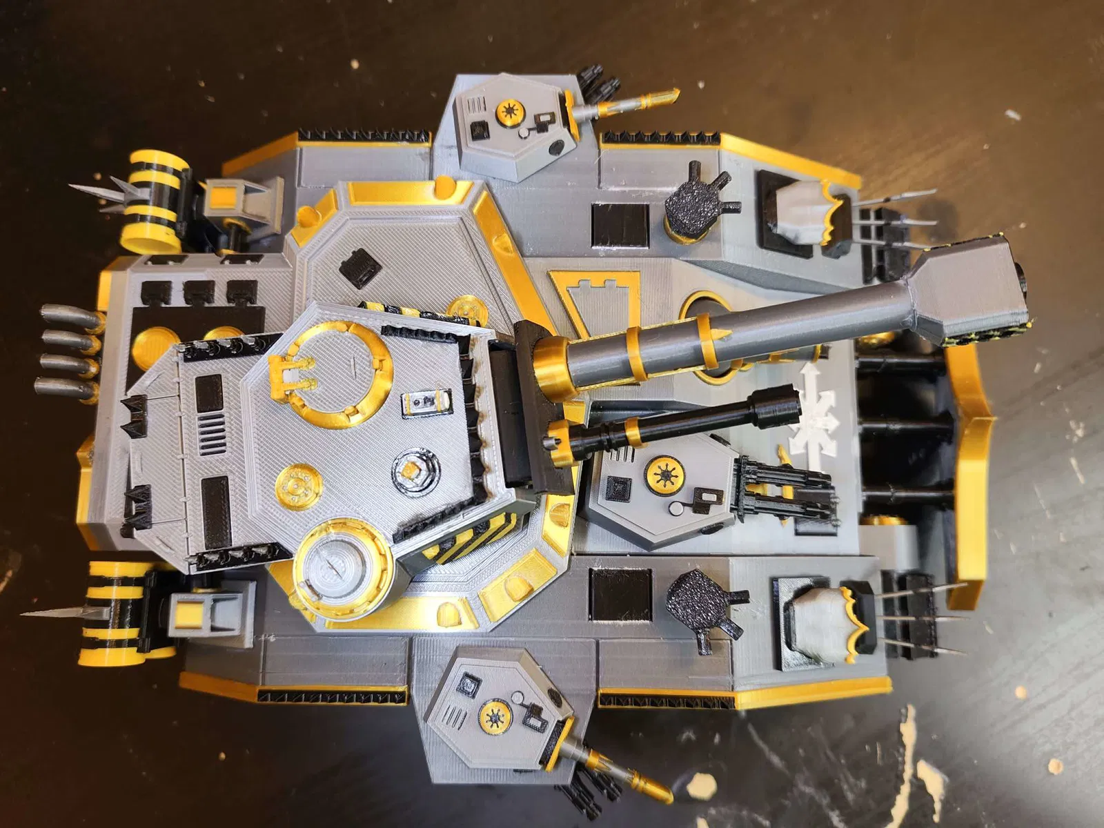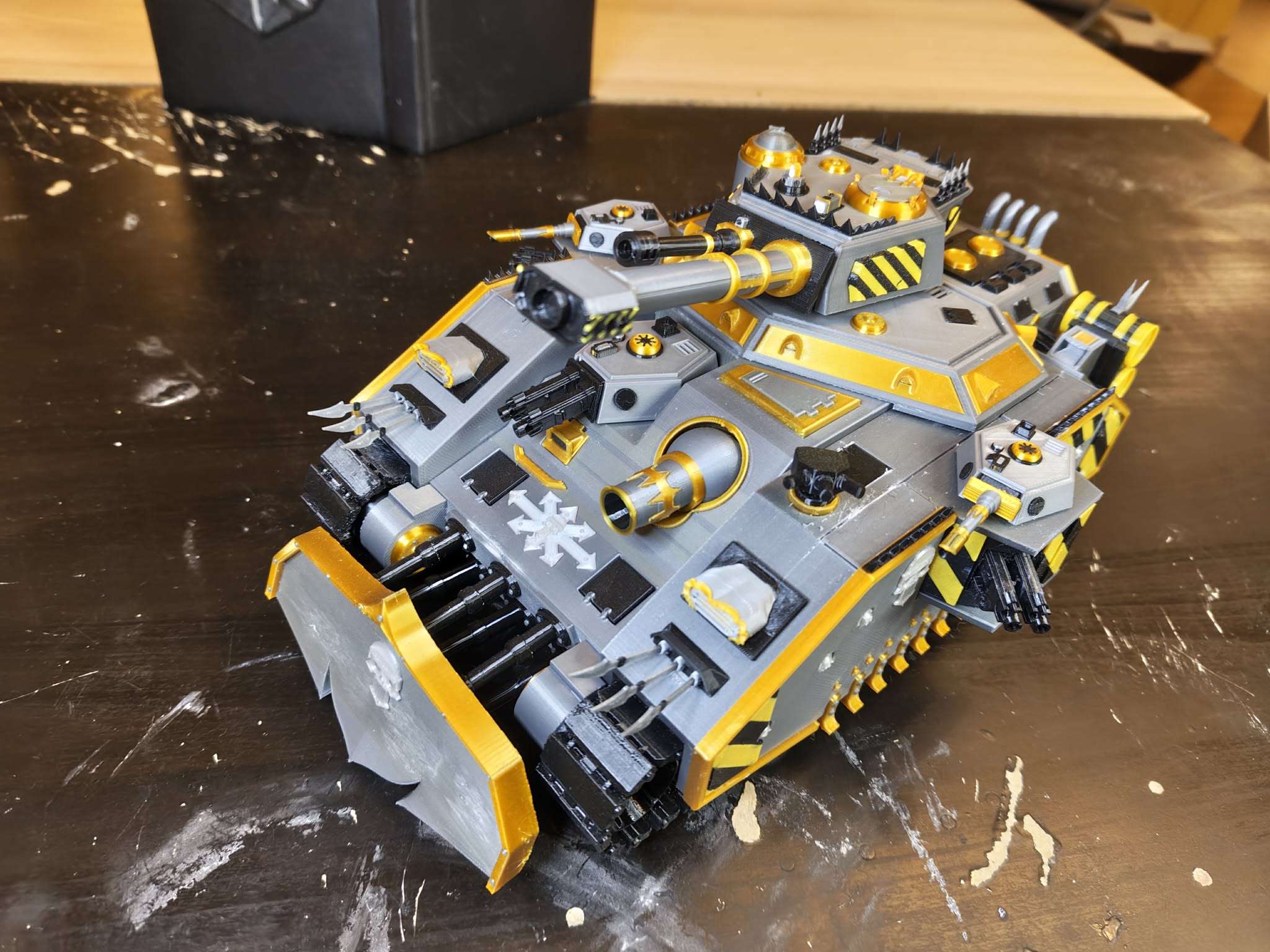 Bản “very evil” của Ferrum Fighters Cursesword trong Grimdarkfuture 40k: xe chiến đấu siêu nặng kiểu tank/pháo đài. In rất chậm và hao vật liệu; có mẹo purge khi dùng PLA làm support và đổi từ màu đen.