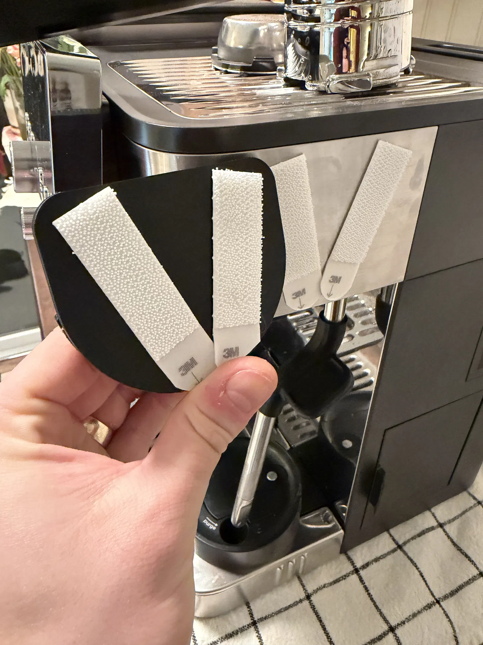 Mình biết vị trí gắn này không phải ai cũng thấy hợp. Tuy nhiên, mình chọn chỗ này vì có thể bắt lên bề mặt có từ tính và khi mình làm latte hằng ngày thì nó cũng không vướng víu gì.