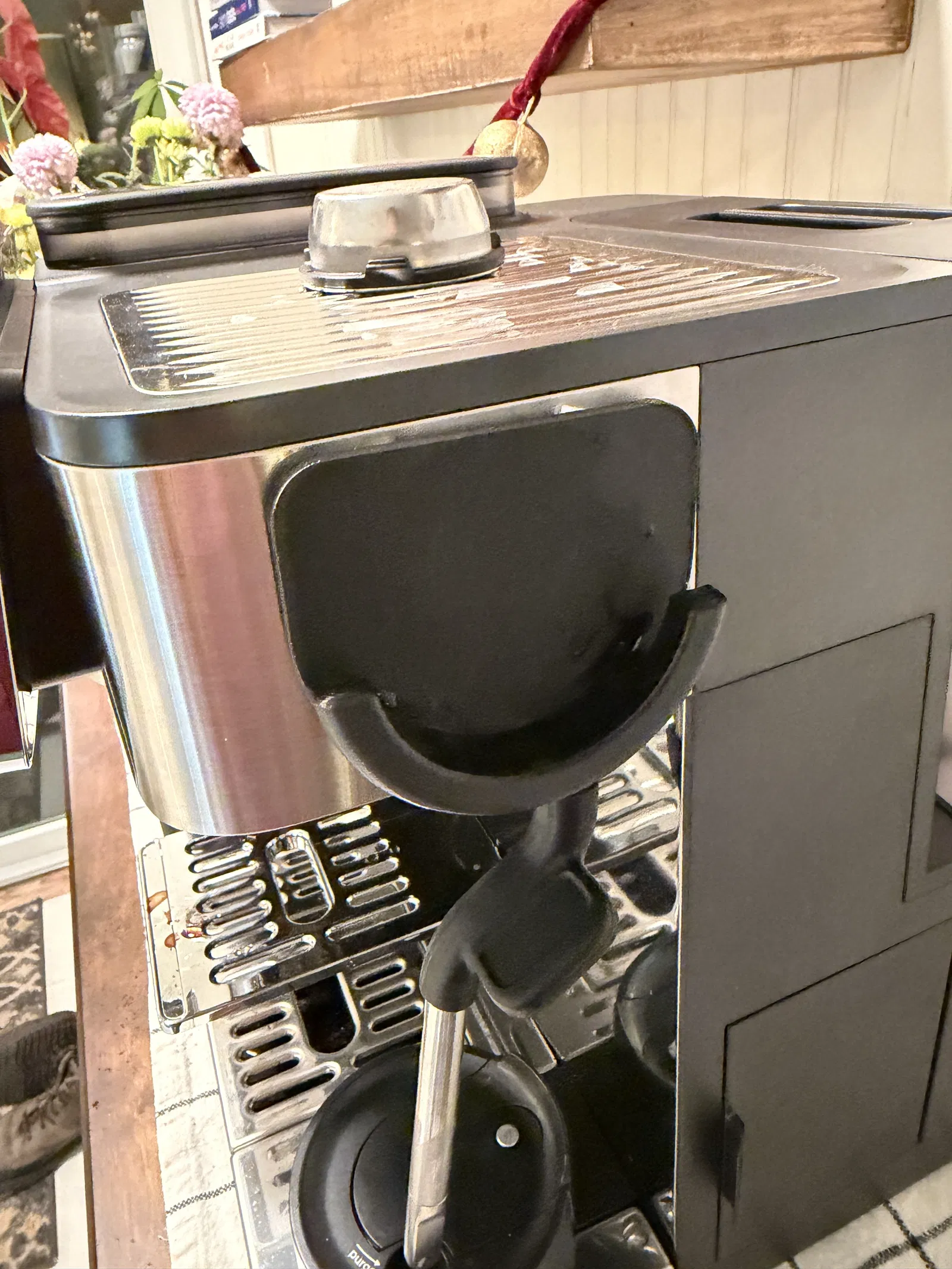 Giá đỡ portafilter cho máy Ninja Lux Cafe Pro, giúp cất gọn vì máy không có vị trí để portafilter hợp lý. Có file `.f3d` (từng thử gắn nam châm) và bản STL cập nhật thêm lỗ thoát nước chống đọng.