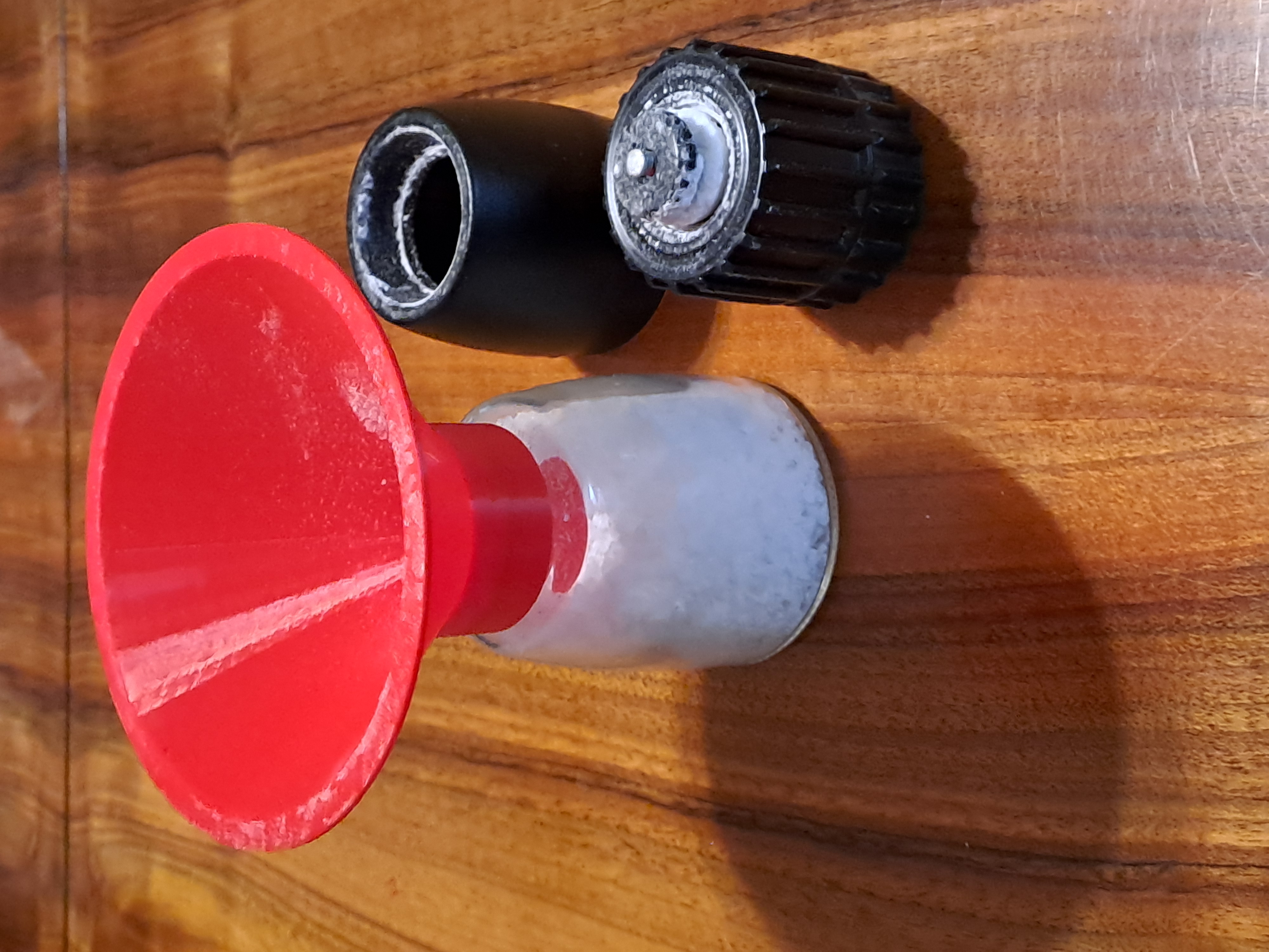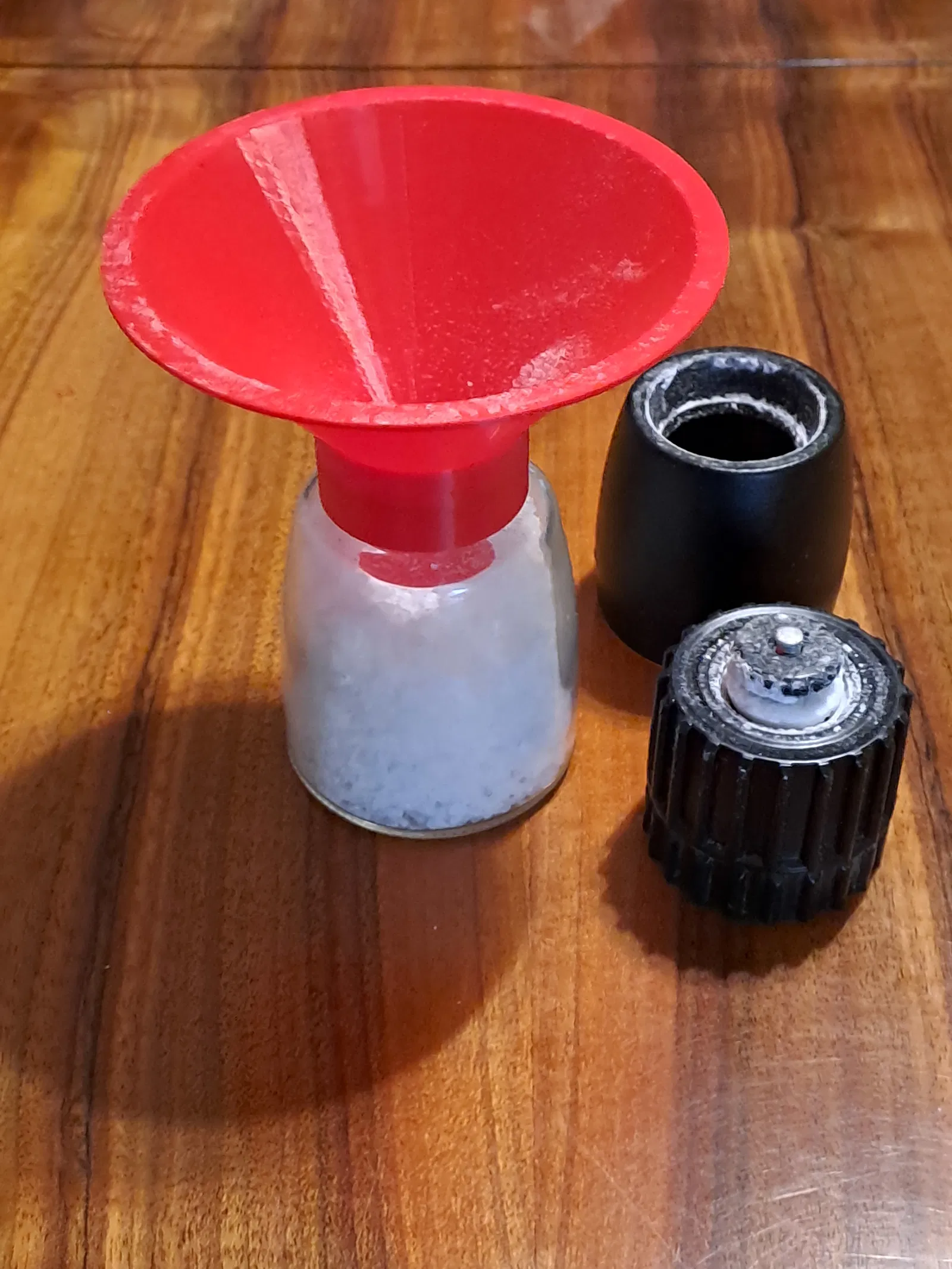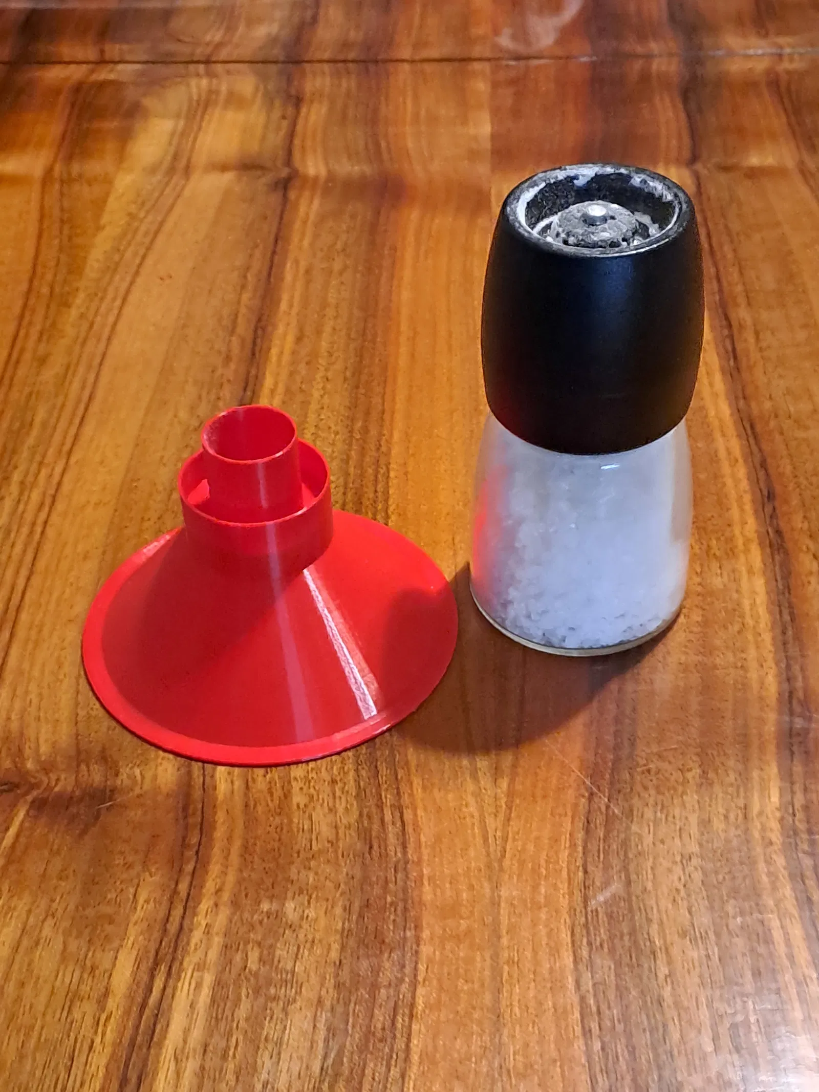 Phễu giúp châm muối/tiêu/gia vị vào cối xay Ikea IHÄRDIG gọn gàng, ít rơi vãi. Có 2 kích cỡ (bản nhỏ chưa test). Gợi ý in PLA: nozzle 0.4mm, layer 0.2mm, 10% gyroid infill, top/bottom concentric.