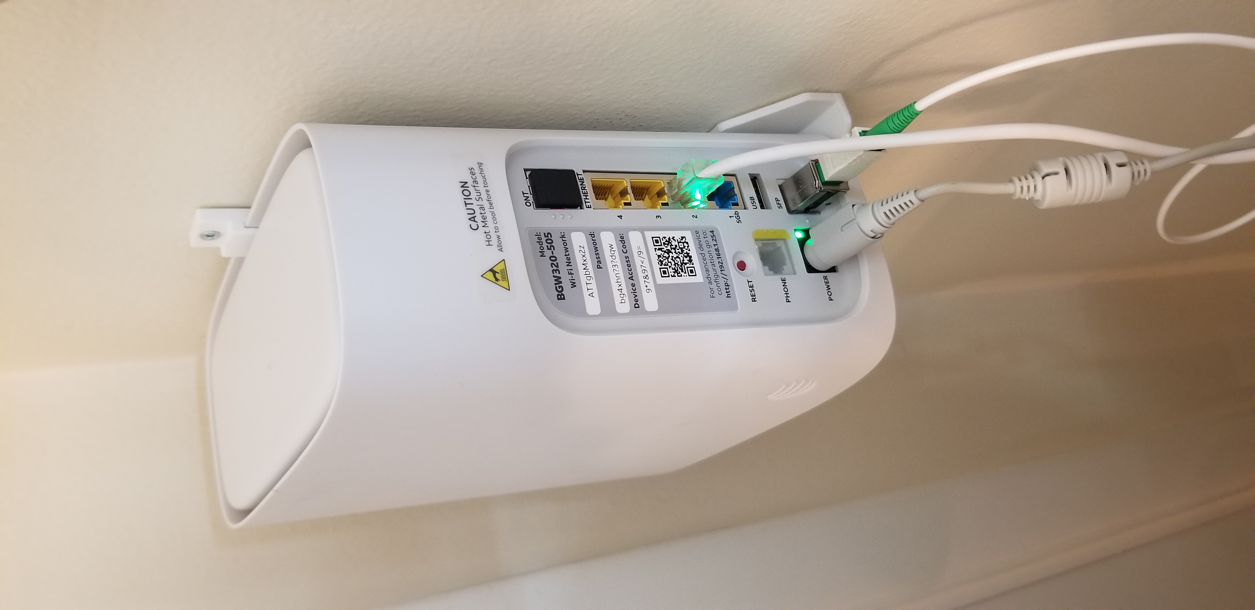 Giá treo tường cho modem quang AT&T BGW320, gồm kệ đỡ có retaining tabs, top clip và ngàm treo bộ nguồn tùy chọn. Bắt tường bằng flat head screws (3 vít) với tắc kê bất kỳ. In PLA 210°C, bed 60°C; top clip cần supports.