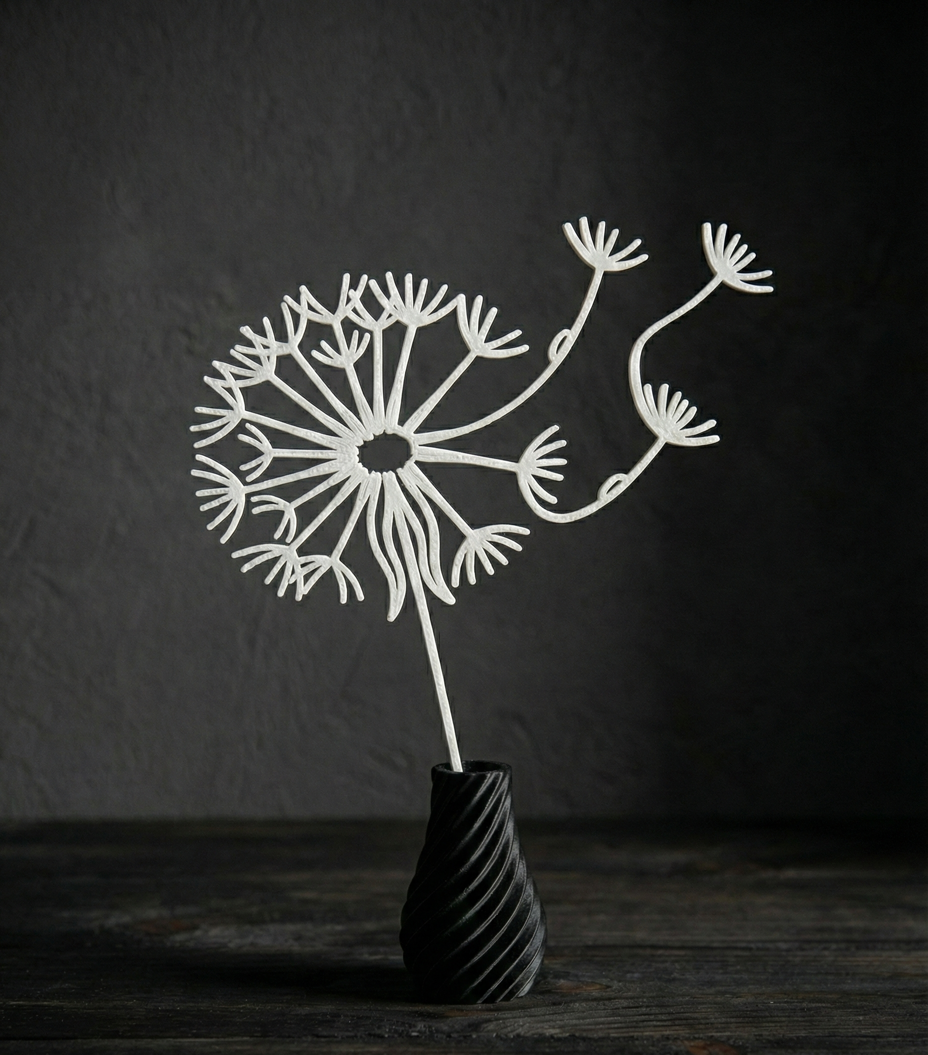 Bộ decor bồ công anh mảnh mai, in không cần supports, kèm các hạt “bay” để tạo hiệu ứng gió thổi sinh động cho bình hoa hoặc mảng tường. Tốn ít filament, in nhanh, hợp làm quà và trang trí tối giản.