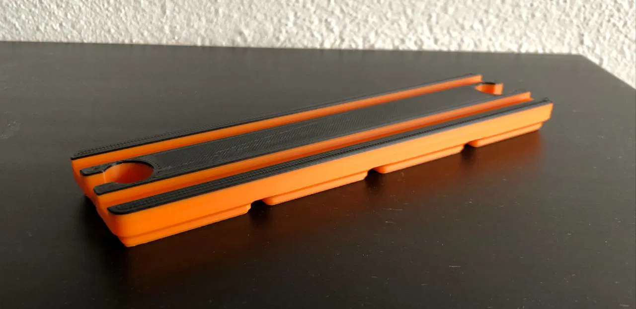 Vì mình không tìm được track nào có đế Gridfinity, nên mình đã làm mẫu track Gridfinity nhỏ dạng 1x2x'2' (cao 12mm, nên phần lớn là 2U). Mẫu này có thể dùng để cất/để trong hệ Gridfinity, hoặc dùng như một đoạn train track bình thường trong layout.