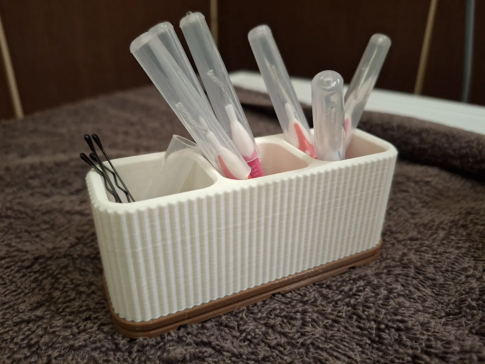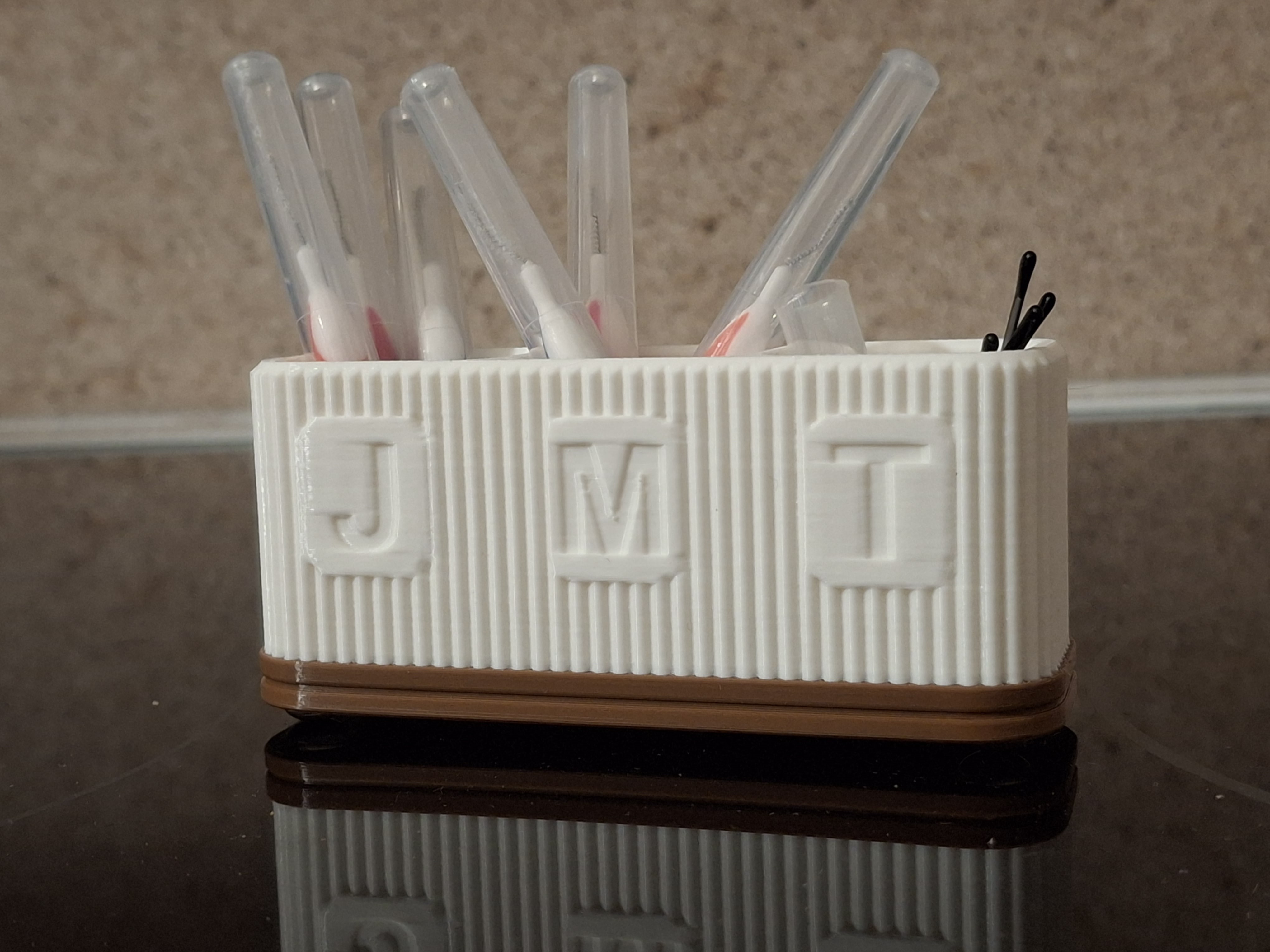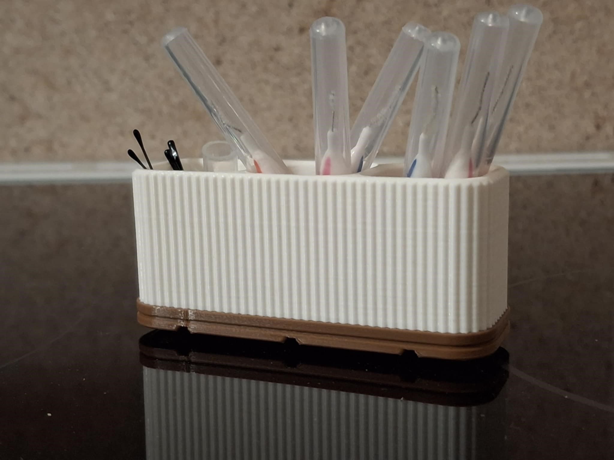 Kệ đựng đồ nhỏ trong phòng tắm, tối ưu cho bàn chải kẽ răng. Thiết kế có độ dốc và rãnh thoát nước, có vị trí dán miếng chống trượt d=8mm. In dễ, không cần supports; muốn 2 màu thì pause ở 6mm để đổi filament.