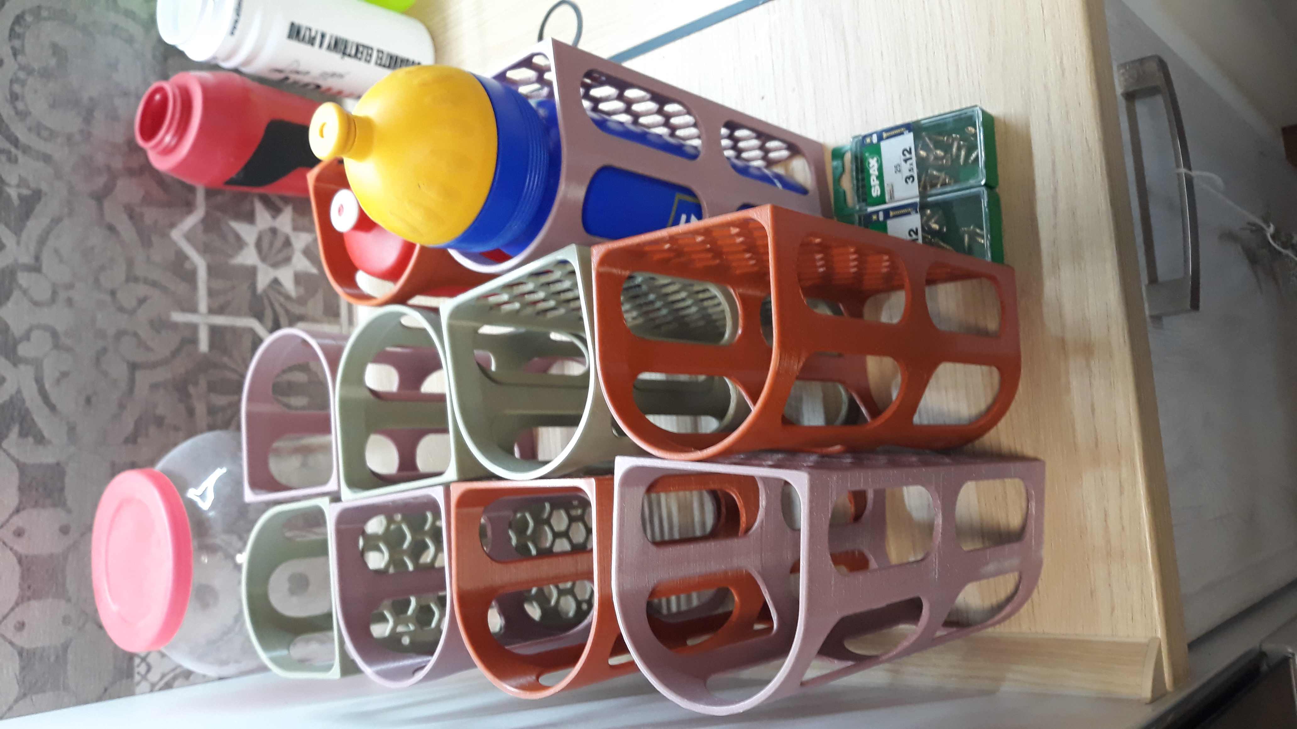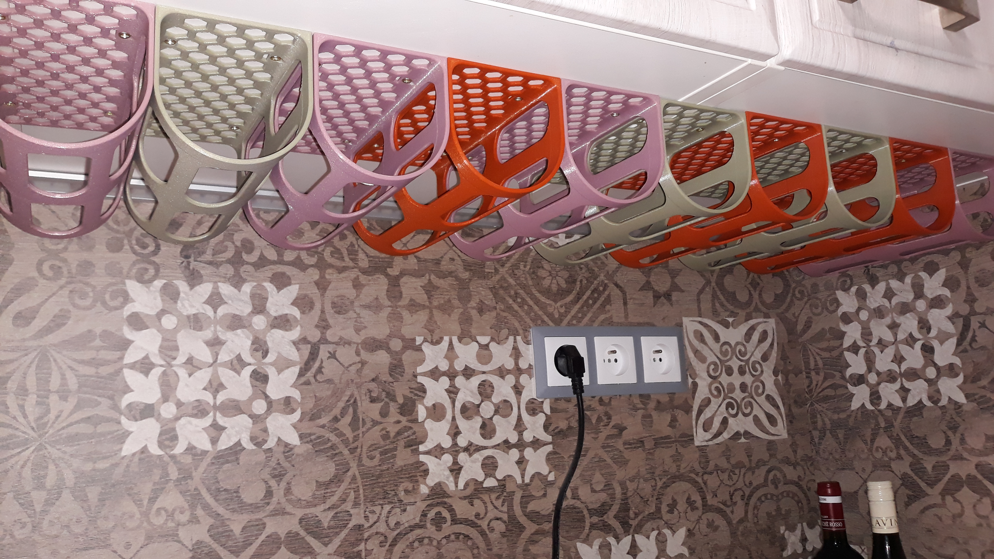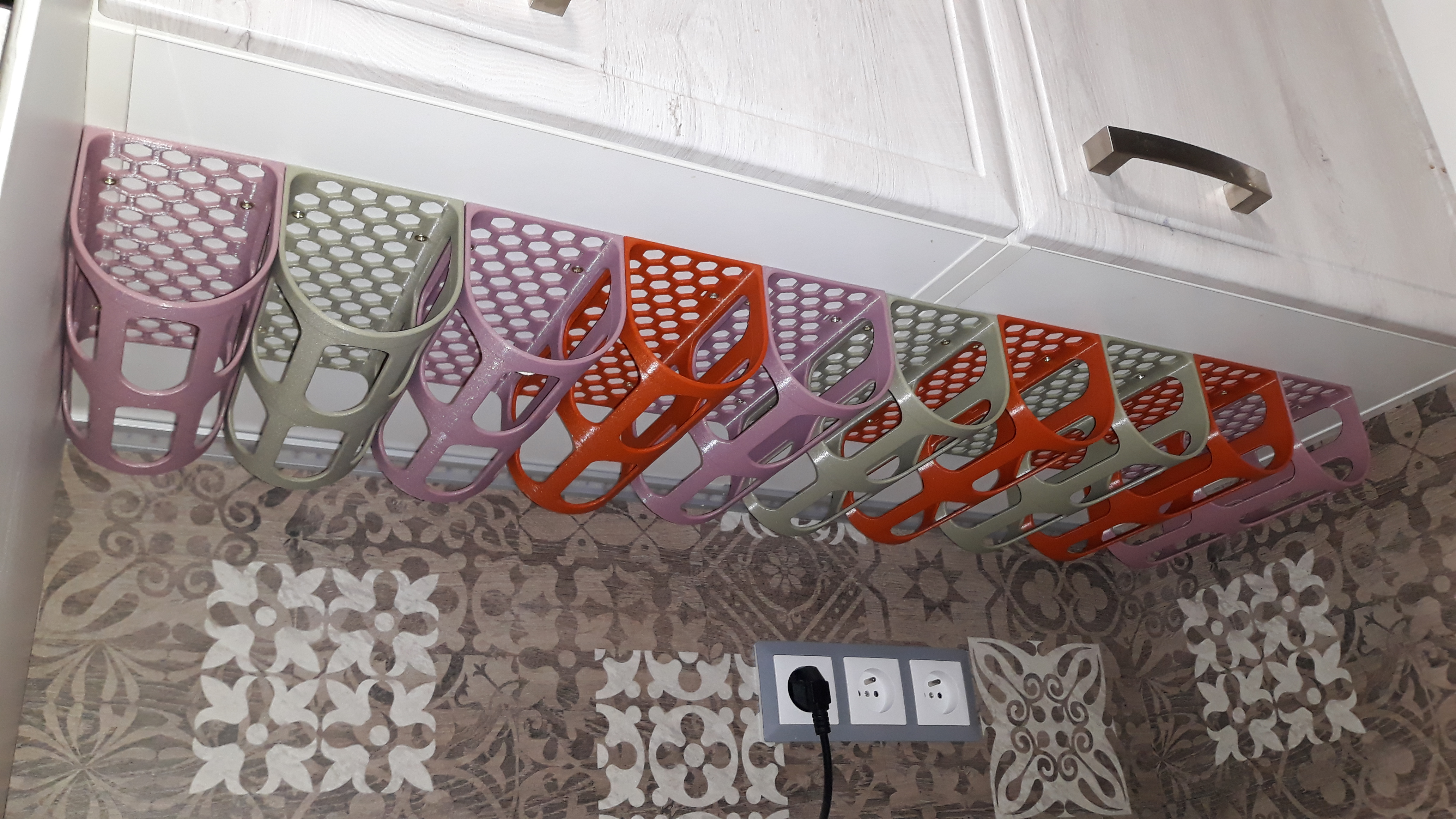Giá đỡ chai gắn dưới bàn, phù hợp dùng trong gian bếp để cất gọn chai/bidon dưới mặt bàn, giúp tiết kiệm không gian và giữ khu vực bếp ngăn nắp hơn.