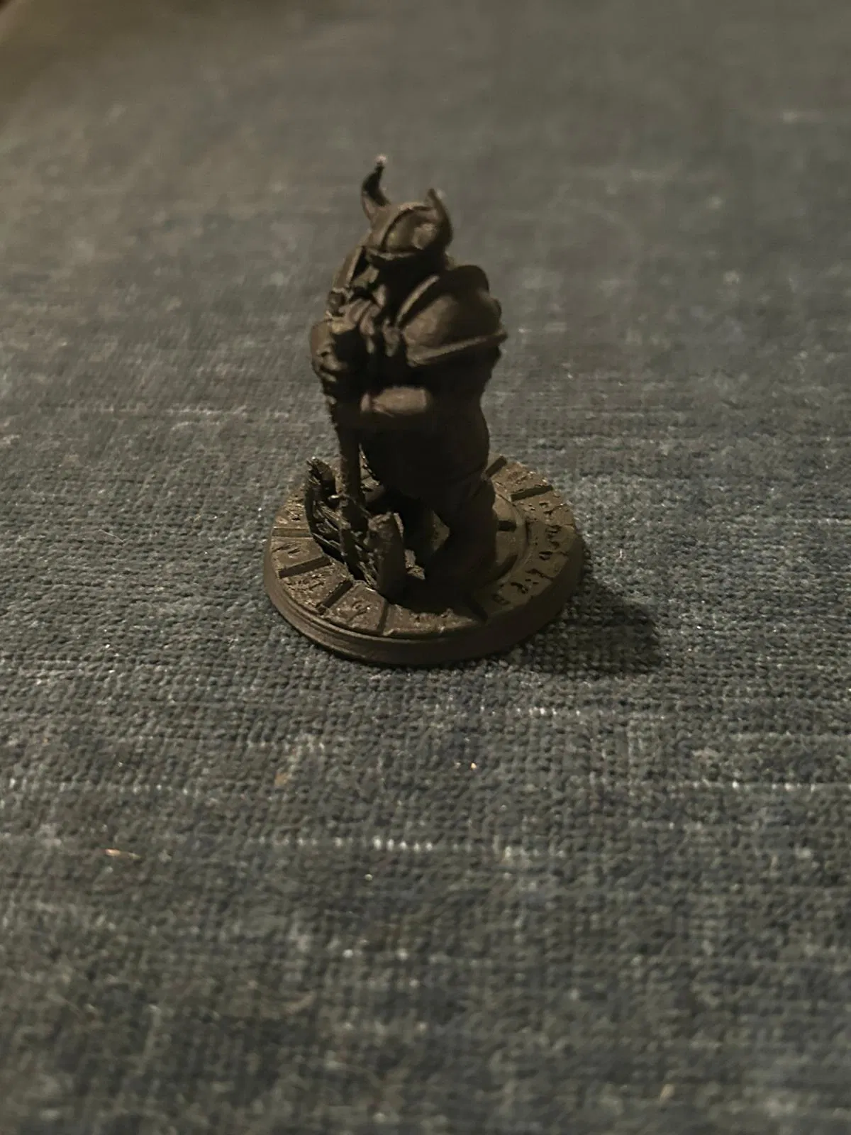 Tượng/miniature chiến binh Barbarian cho Dungeons & Dragons: giáp nặng, mũ sừng biểu tượng, dáng đứng trang nghiêm. Có bệ tròn khắc họa tiết rune cổ, phù hợp làm đạo cụ bối cảnh hoặc nhân vật chơi.