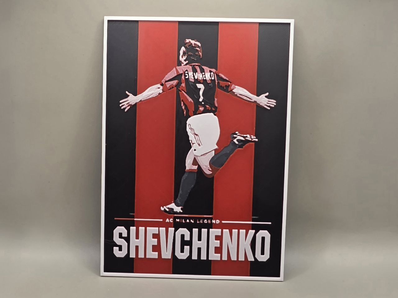 Mẫu HueForge chân dung Andriy Shevchenko trong màu áo AC Milan. In 100% infill, layer height 0.08mm (base 0.16mm), kích thước 120x170mm. Dùng 5 filament và đổi màu theo mốc layer hướng dẫn.