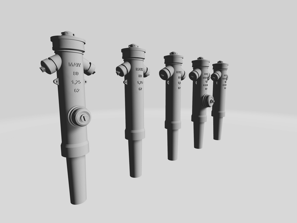 Các mẫu 3D này mô phỏng hydrant chữa cháy nổi (DDR-Überflurhydranten), phiên bản A theo tiêu chuẩn TGL 11238/01 (tháng 11/1970) ở tỷ lệ 1:100.