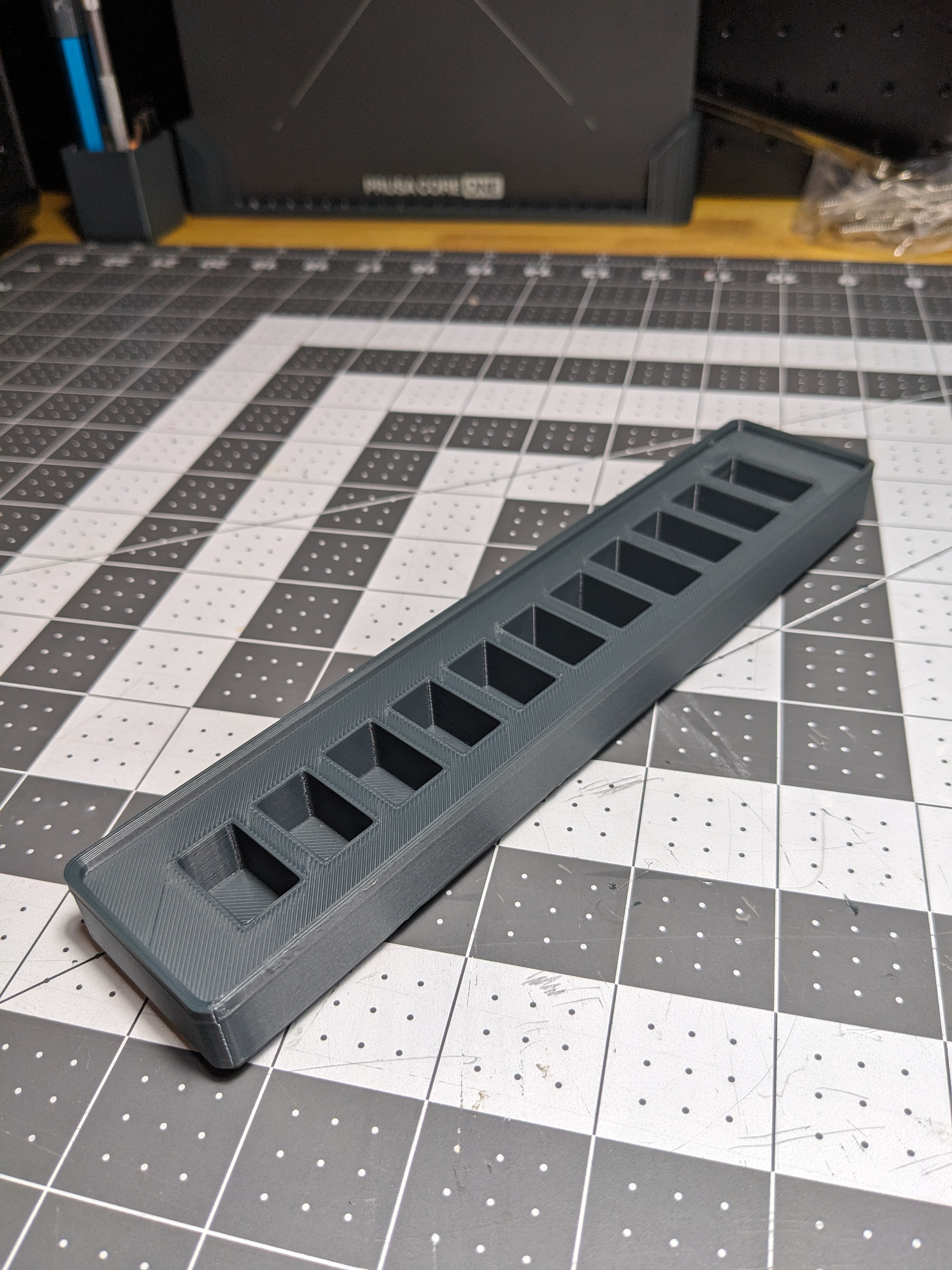 Mình lấy ý tưởng từ thiết kế của jgremlin rồi remix lại để vừa với bộ cờ lê crowfoot của mình. 4 cây lớn nhất trong bộ của mình không vừa với model của bạn ấy, nên mình làm lại các hốc (pockets) bằng cách đo từng cây và áp cùng một mức tolerance cho tất cả. Độ vừa khít có thể khác nhau tùy theo dung sai sản xuất của từng dụng cụ.