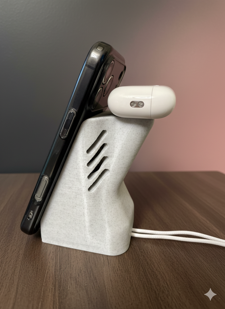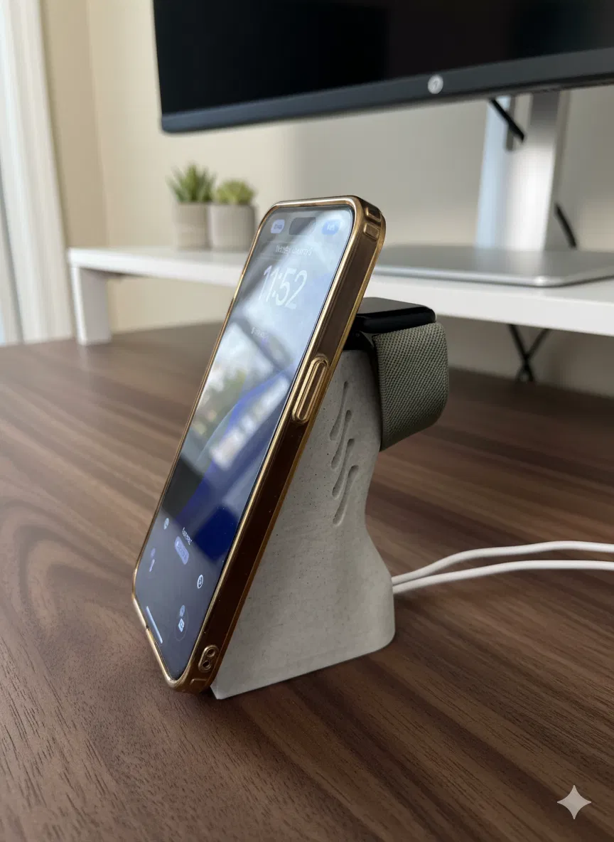 Đế sạc dùng cho bộ sạc Apple MagSafe, tương thích mọi thiết bị MagSafe. Thiết kế lắp ma sát (0.1mm clearance), có khe thoát nhiệt, rãnh đi dây ẩn và khoang thêm tạ. In PLA, 0.1mm, không cần supports.