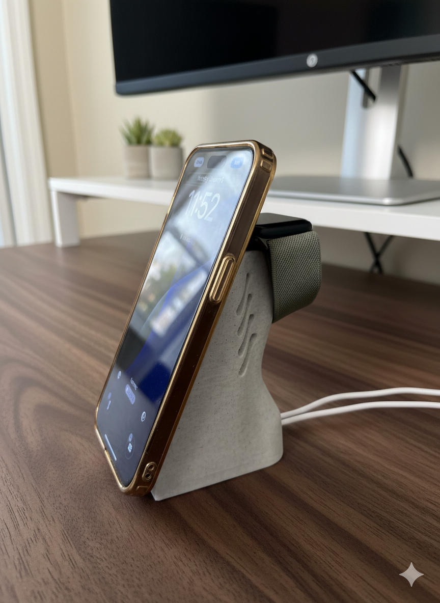 Đế sạc này được thiết kế cho bộ sạc Apple MagSafe (sạc điện thoại 55.5mm, sạc Apple Watch 27.6mm), khi lắp vào sẽ “snap” chắc theo kiểu ma sát (chừa hở 0.1mm).