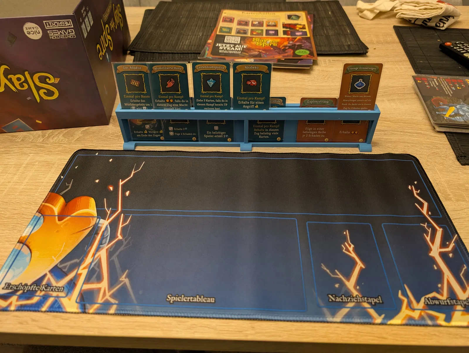 Nếu bạn giống tôi mà bàn chơi game của bạn hơi chật chội lúc đang chơi hết ván, thì cái đế này sẽ giúp bạn tiết kiệm không gian nè Nó cũng hay nếu bạn muốn cất giữ mấy cái Relic/Potion qua đêm/qua lúc nghỉ giải lao mà cần dọn dẹp bàn. Bạn thậm chí có thể thêm chỗ cất mấy cái token như shivs hay orbs ở hai bên, tha hồ sáng tạo nha!