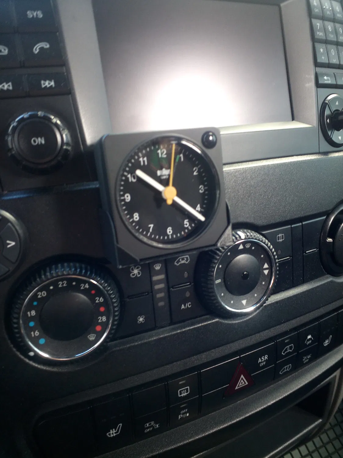 Tôi muốn một đồng hồ tương tự có thể đọc tốt trong xe của tôi. Tôi thấy Braun BC02XB là hoàn hảo về hình thức và chức năng, và quyết định tạo một giá treo, tôi đã sửa bằng băng đôi 3M VHB trên bảng điều khiển. Đồng hồ có thể dễ dàng được gỡ bỏ để điều chỉnh hoặc thay thế pin và do đó cũng được sử dụng làm báo thức. Tôi đã in Mount in Pla.
